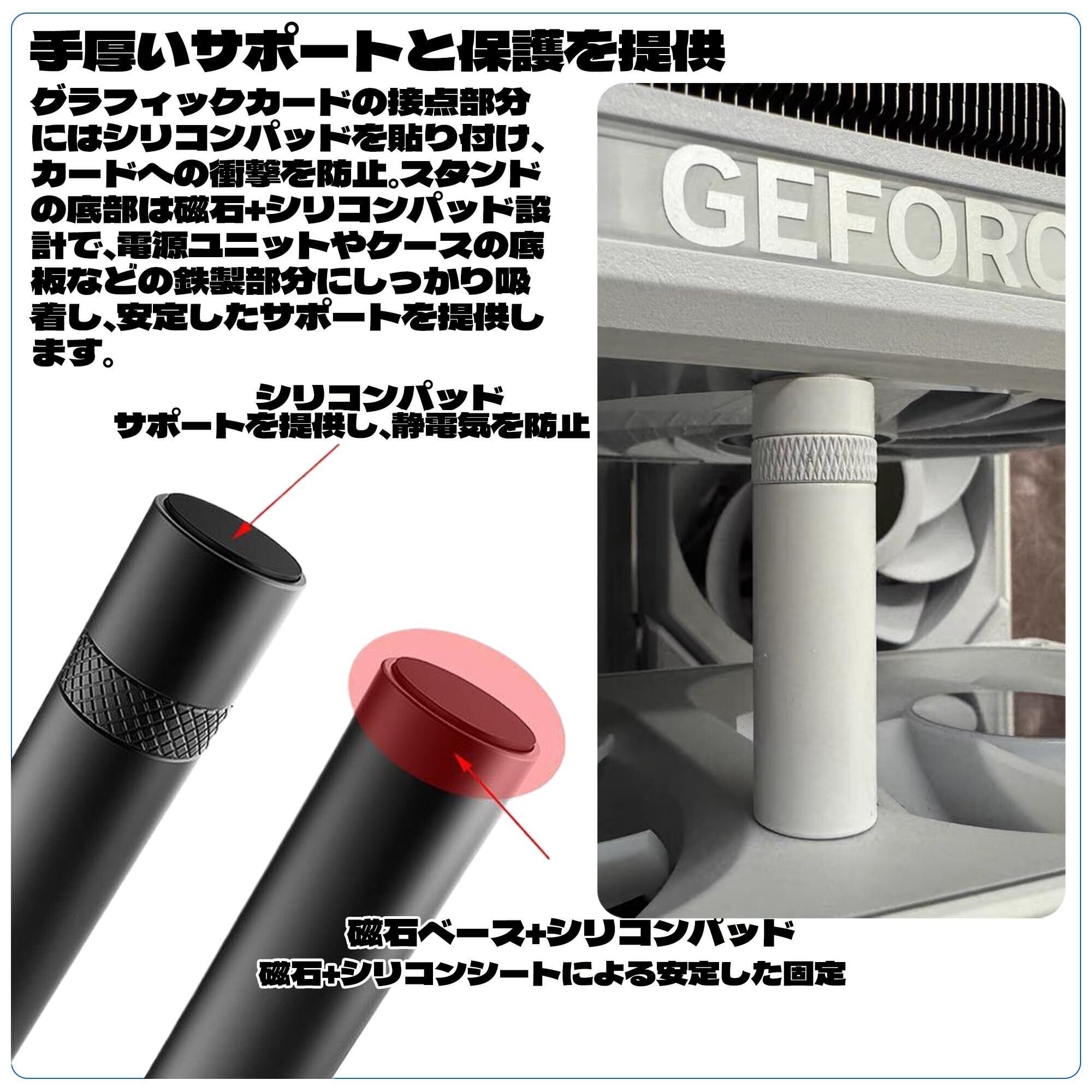 【製品の強み】当社のグラボ支えは、新しいデザインでコンパクトかつ軽量です。 gpu ステー 部分には衝撃吸収パッドを装備し、ベースは光沢仕上げで高級感があります。 さらに、底部には強力な磁石が内蔵されており、設置が簡単で安定性も抜群です。