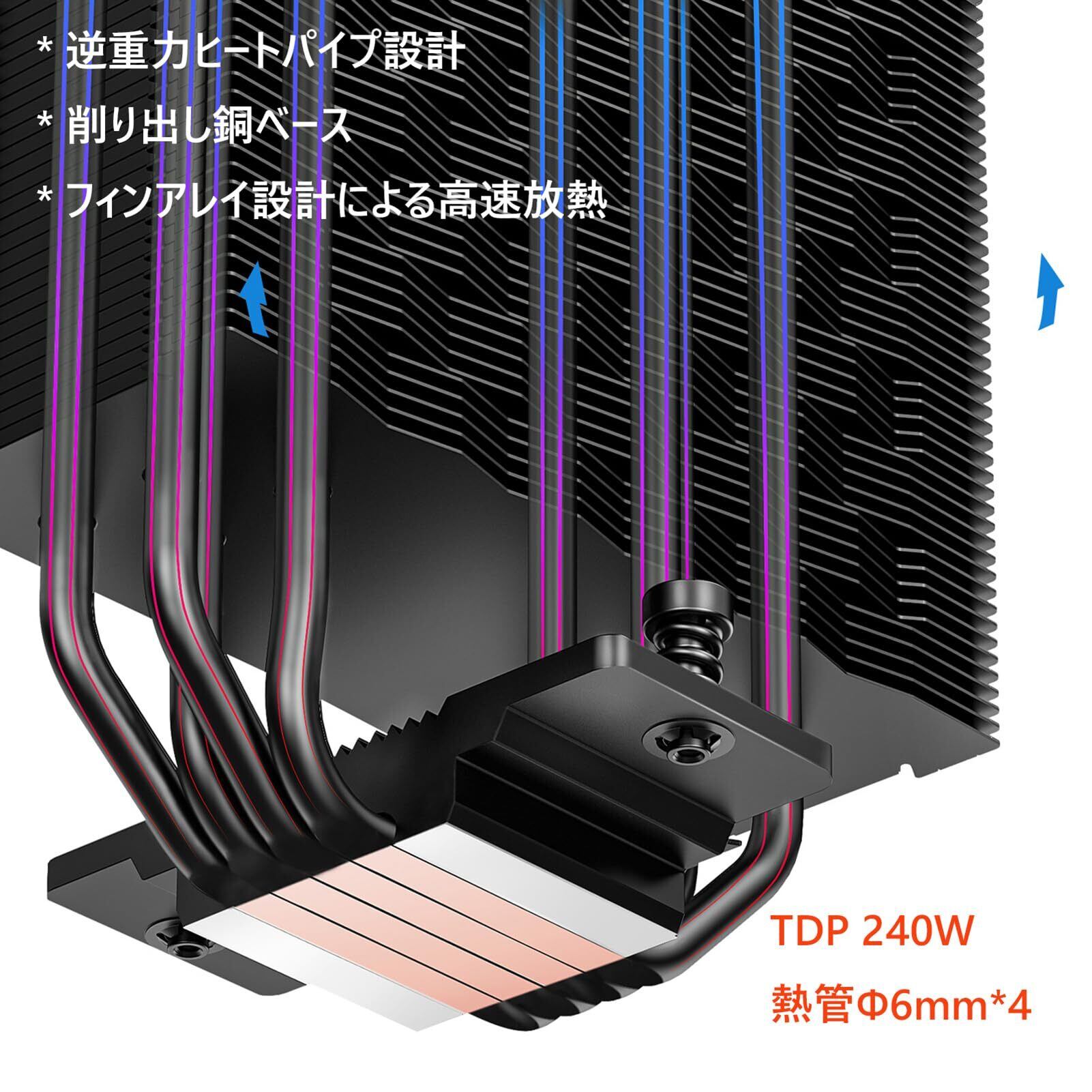 【逆重力ヒートパイプΦ6mm*4】反重力ヒートパイプ設計を採用し、CPUの放熱はより速く、より安定している。同時に、水平、垂直、その他の角度に取り付けられ、冷却性能に影響を与えず、常に優れた放熱効率を提供します。