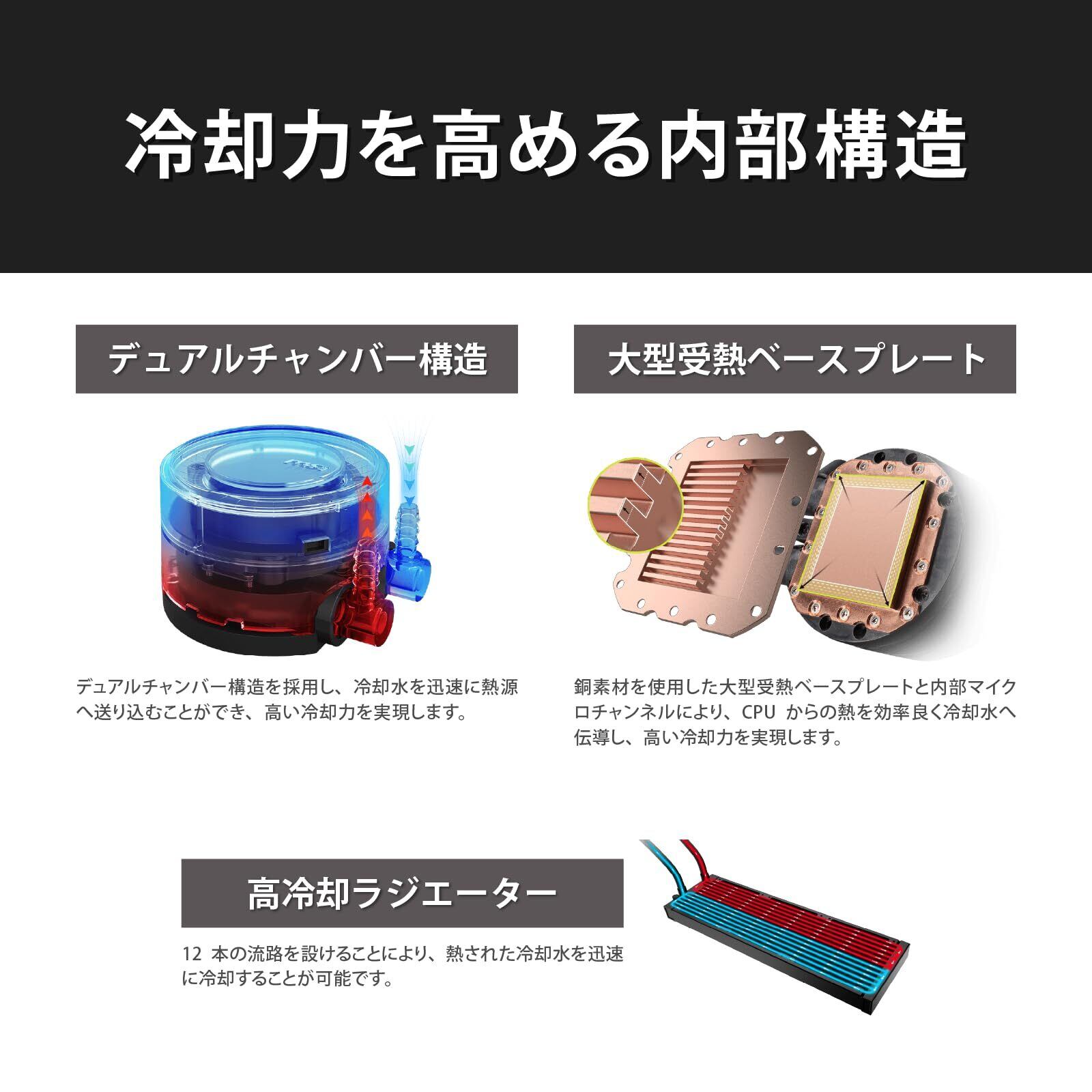 他に類を見ないデザインの美しい水冷ヘッドデザインの水冷CPUクーラー。耐久性と静音性を追求した超寿命モデルで、3年を実現しています。