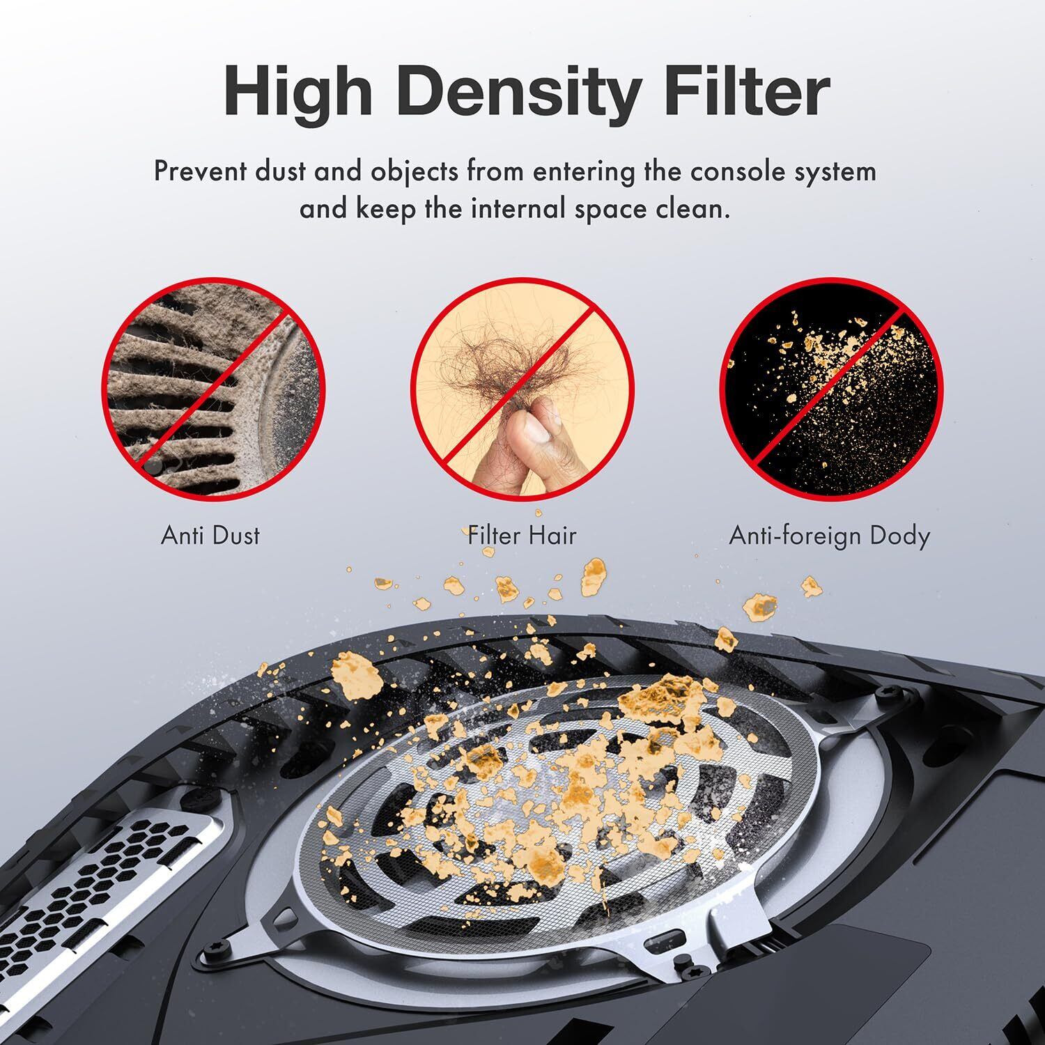 【PlayStation 5専用設計】防塵フィルターカバーセットは、PlayStation 5本体専用に設計されています。本体のファンと通気口にぴったりと収まり、ずれ落ちることなく、本体の動作を妨げません