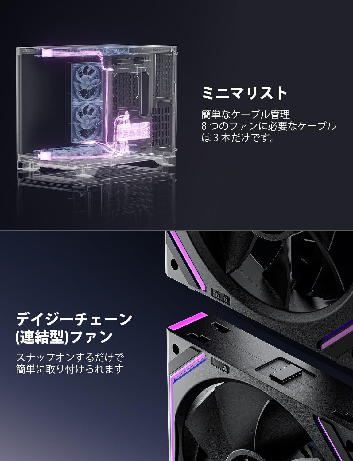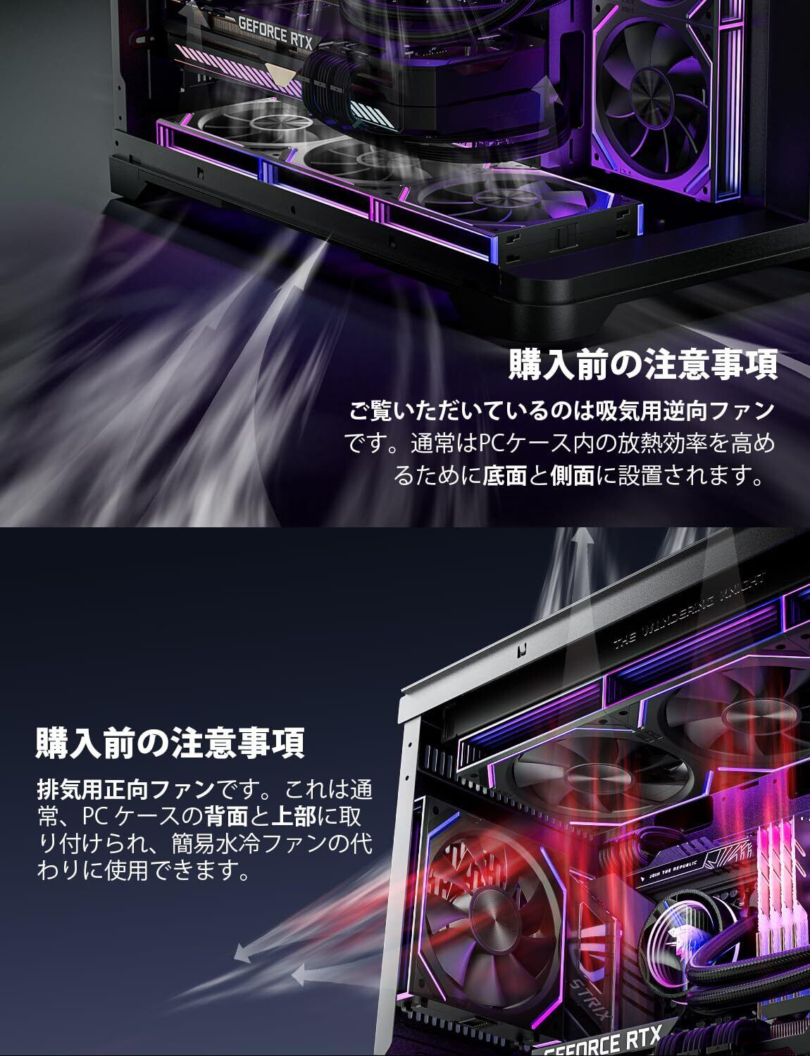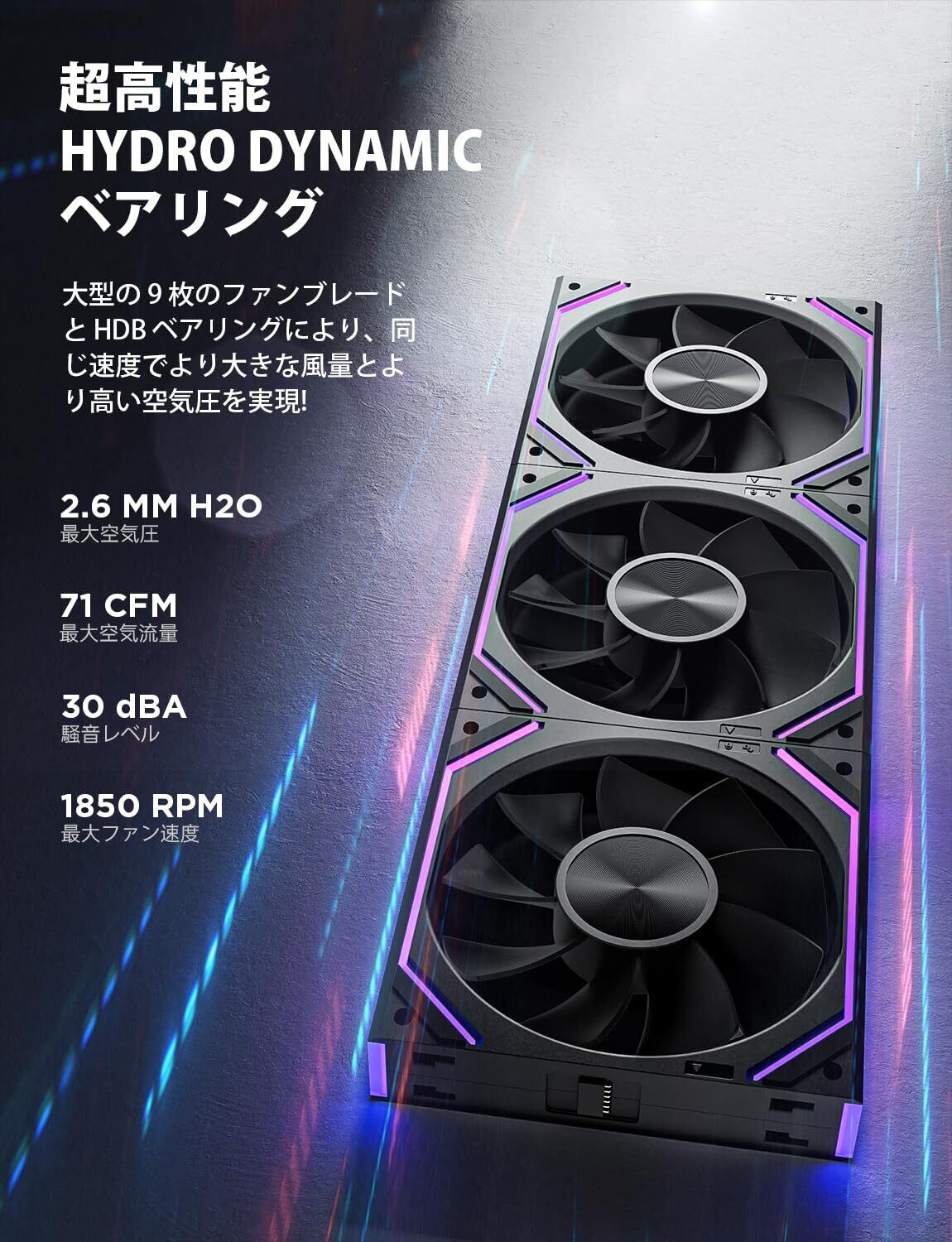 [仕様]: モデル:DAWN-黒-R。数量:3本。サイズ:120*120*2.5。逆向(吸気)。デイジーチェーンファン。回転数:900-1850 RPM/Min。ノイズ:6-30 dB(A)。風量:71 CFM 。風圧:2.6mmH2O。ベアリングのタイプ:ハイドロダイナミックベアリング。寿命:50000時間以上。240/360mmのCPU水冷高さに対応。