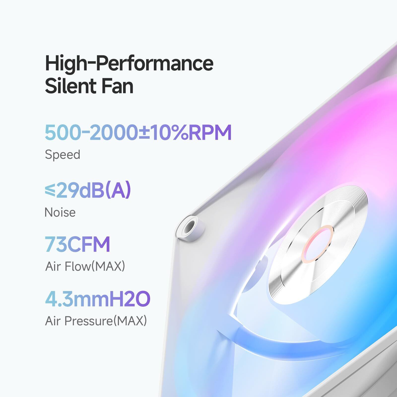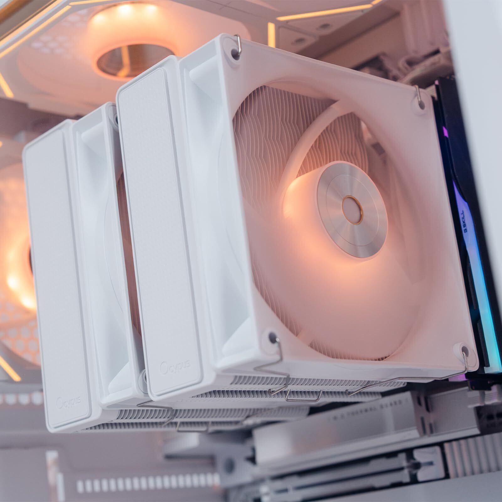 クーラー高性能静音ファン:2つのARGB高性能静音ファンを搭載し、ファンの吸気曲線は繰り返し研磨されて、効果的に気流を増加させています。クーラーはミニマリストのデザイン言語を継続し、円形の要素と統合することで、全体的な質感を高めています