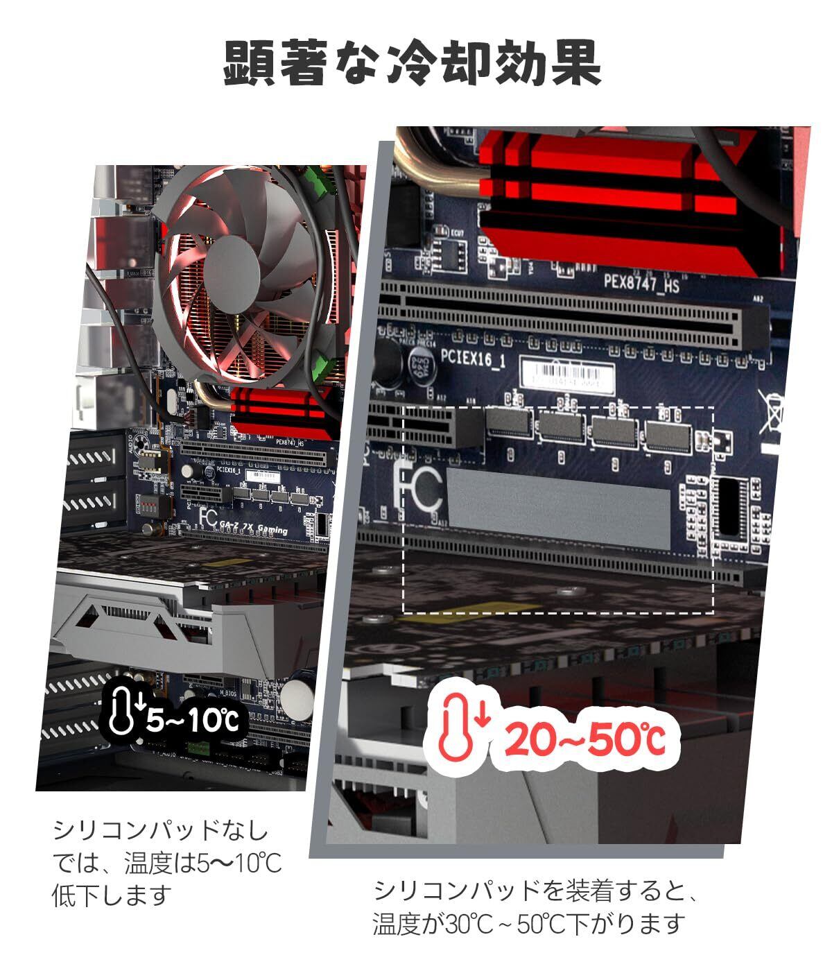 【高効率放熱サーマルパッド】高密度熱伝導シリカゲル採用(熱伝導率12.8W/mk)で、材料は柔らかく、圧縮性能と放熱性能,両面自然粘着設計。SSD/CPU/GPUの接触面を完全密着させ、従来比30%向上した放熱性能を実現。精密電子部品の温度上昇を効果的に抑制します、あと絶縁性を有する。吸音を抑える効果があります。そして、設置、テスト、および再利用が容易です
