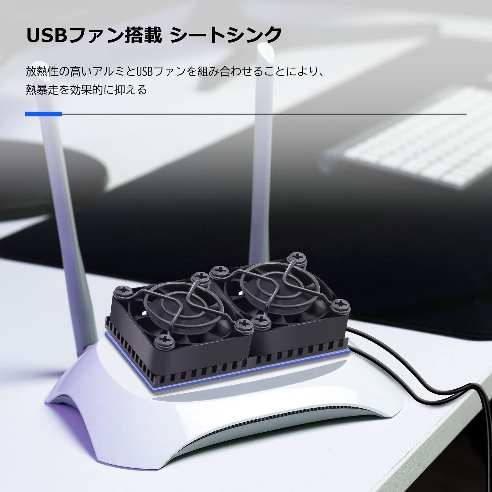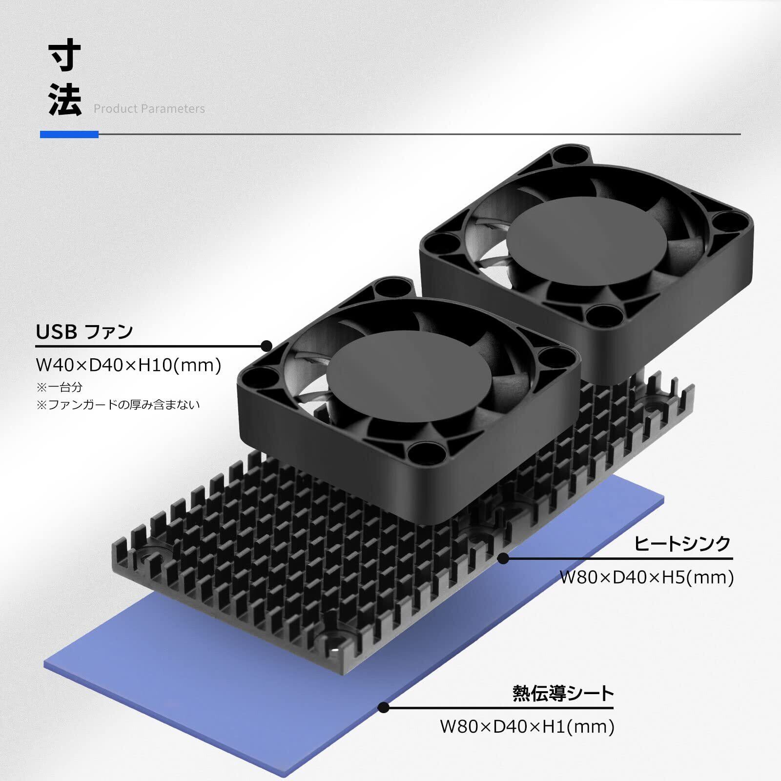 4cm USBファンが搭載されており、通常のヒートシンクより更なる放熱効果を得ており、熱暴走対策に最適です。また、USB冷却ファンが三段階風量調整ができ、静かに回転します。