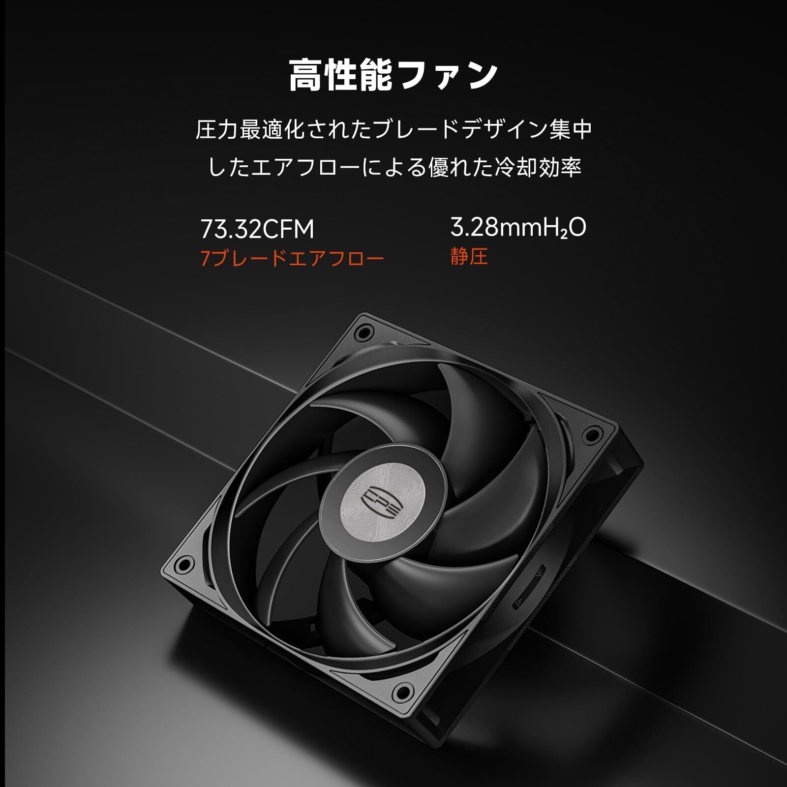 【PWM ファン(静圧&風量重視)】ハイドロリックベアリングファン(7枚ブレード)搭載、500~2200rpm(±10%)で可変制御。最大静圧 3.28mmH₂O、最大風量 73.32 CFM により、効率的に熱を取り除きます。