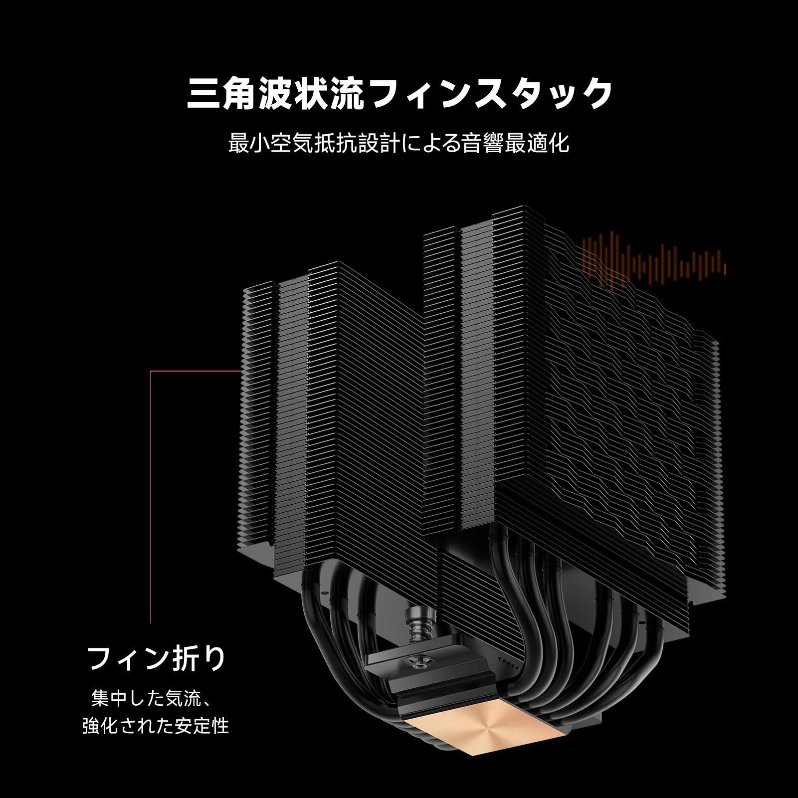 【高冷却性能・デュアルタワーデザイン】6本Φ6mm ヒートパイプ+波形構造フィンスタックが熱伝導を最大化。Triangle Wavy Flow Finstack による集中気流設計で、高負荷でも安定した冷却性能を実現。TDP最大265W のCPUにも対応。