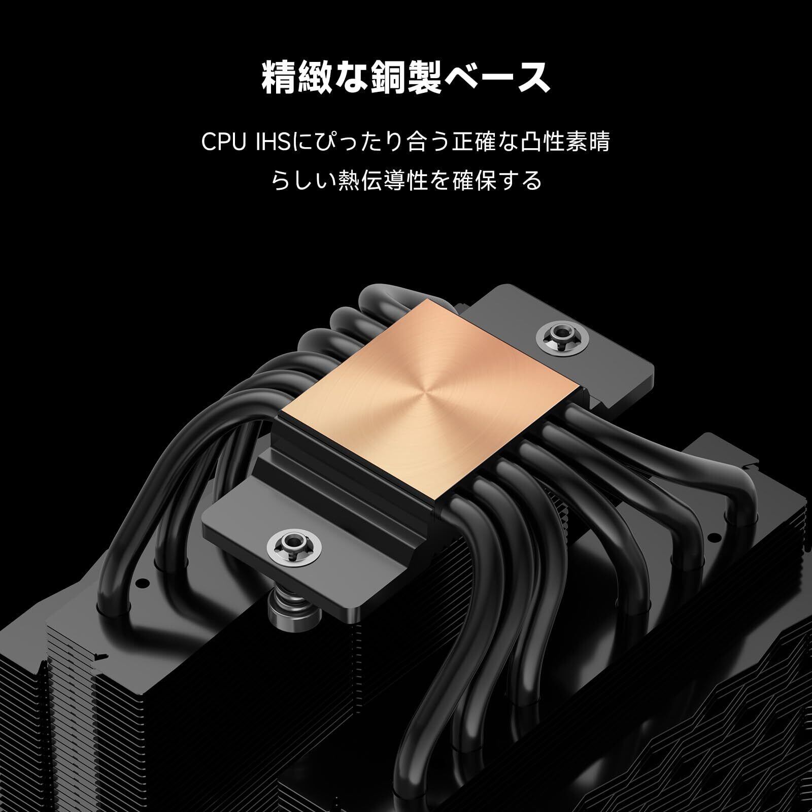 【銅ベース&精密加工】精密研磨された銅ベース(Fine-polished Copper Base)を採用。凸形状のベースが CPU の IHS に密着し、放熱効率を向上。Gravity(重力方向)に影響されにくい Next-gen Heatpipe設計。