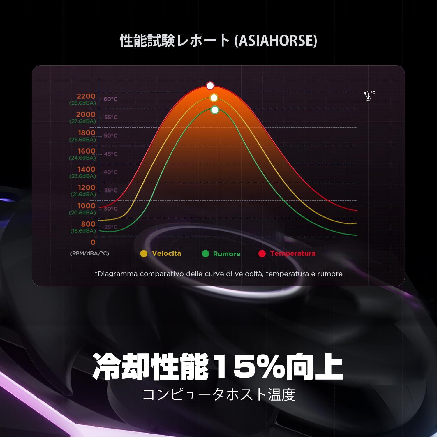 [超冷却効率] このNyotaUltra 120MMデイジーチェーンファンは、大きな曲率のファンブレードとファンブレード面積の増加で設計されており、ファンブレードとファンフレーム間の距離が短くなり、風量と風圧が大幅に増加し、71CFMと2.6mmH2Oの優れた性能に達します。 この革新的な設計により、集中的なゲーム、ビデオ編集、マルチタスクなどの高負荷使用シナリオでは、ファンが効果的に熱を放散し、安定したシステム動作を確保できます。 サイレントモードで低速で動作している場合でも、ファンは効率的な冷却を提供しながら、ノイズを快適なレベルに制御し、静かな環境で仕事やエンターテイメントに集中できます。 このような優れた冷却機能は、ハードウェアを過熱から保護するだけでなく、長期使用中に最適なパフォーマンスを維持し、コンピューターがどのような状況でもスムーズに動作できるようにします。