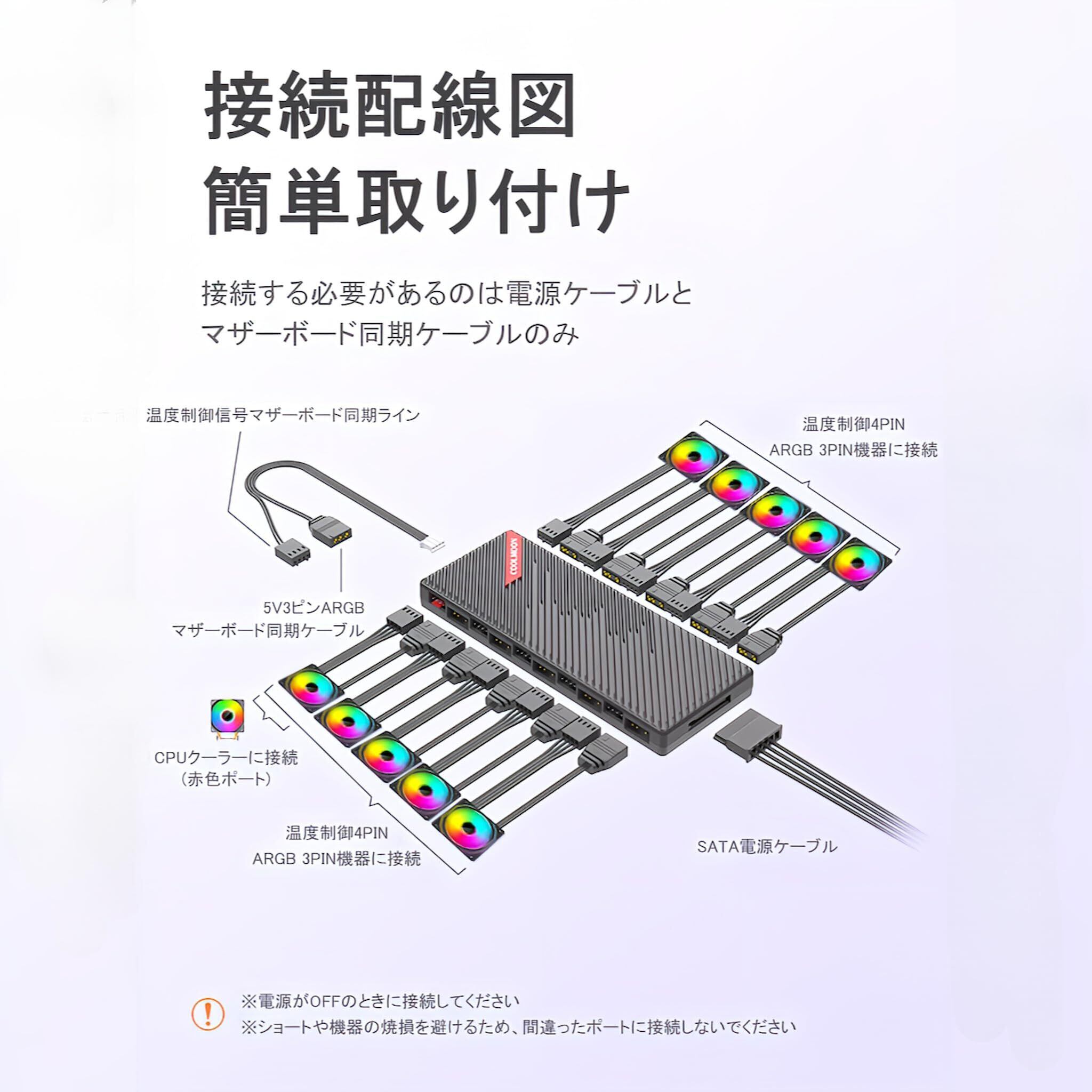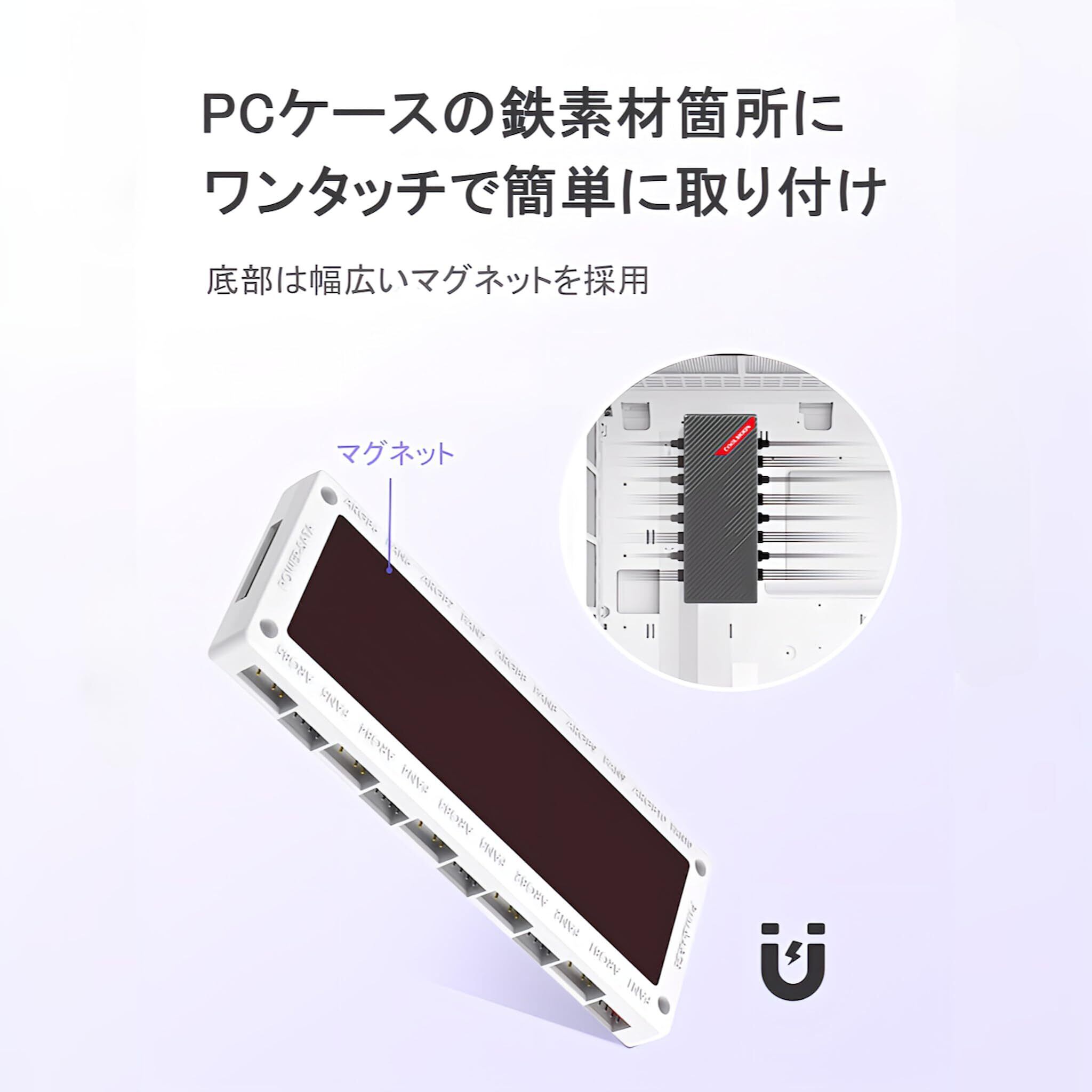 【簡単設置】マグネットで取り付け可能なため、マザーボードの5V ARGB/12V RGBヘッダーとSATAケーブルに接続するだけで、すぐに利用できます。
