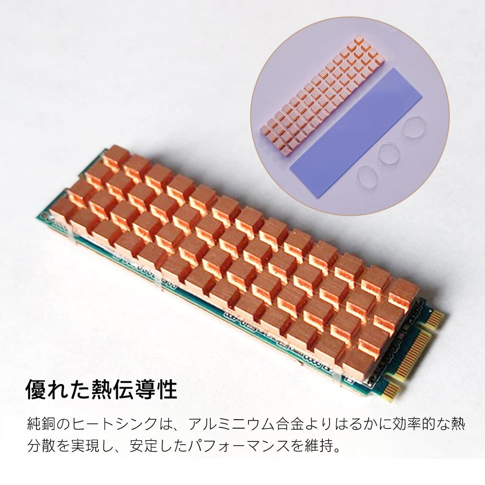 当NVMe M.2 SSD ヒートシンク はM.2 2280 SSDと互換性があります。また、M.2 SSD以外にPS5やニンテンドースイッチ、スマホなど他の発熱端末にも対応可能な純銅ヒートシンクです。