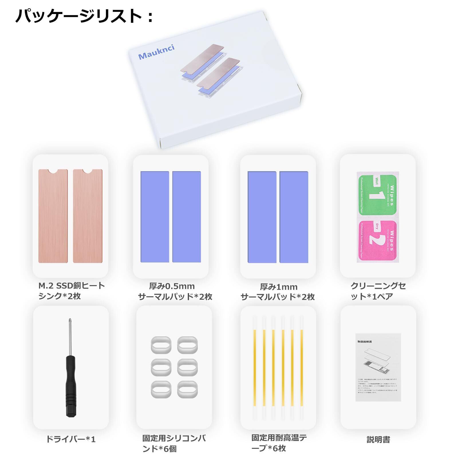 【パッケージ内容】M.2 SSD銅ヒートシンク*2枚、サーマルパッド(厚さ1mm/0.5mm)其々2枚、固定用シリコンバンド*6個、固定用耐高温テープ*6枚、クリーニングセット*1ペア、ドライバー*1、説明書。