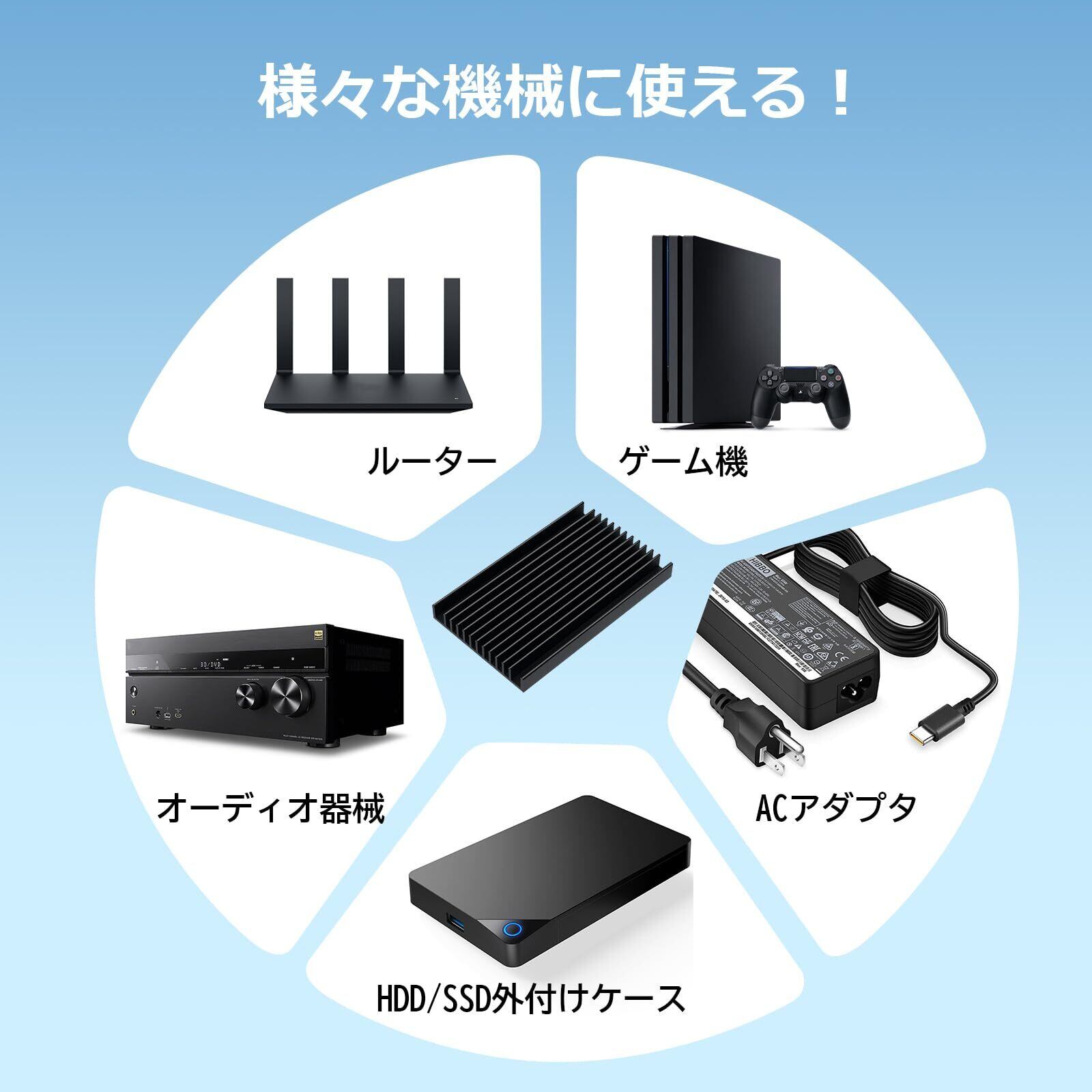 この大型ヒートシンクは、電子機器から発生する熱を素早く空気中に放出し、機器の高性能を維持し、機器の故障を防止することができます。HDD/SSD外付けケース、ACアダプター、ハブ、ルーターなどに適しています。