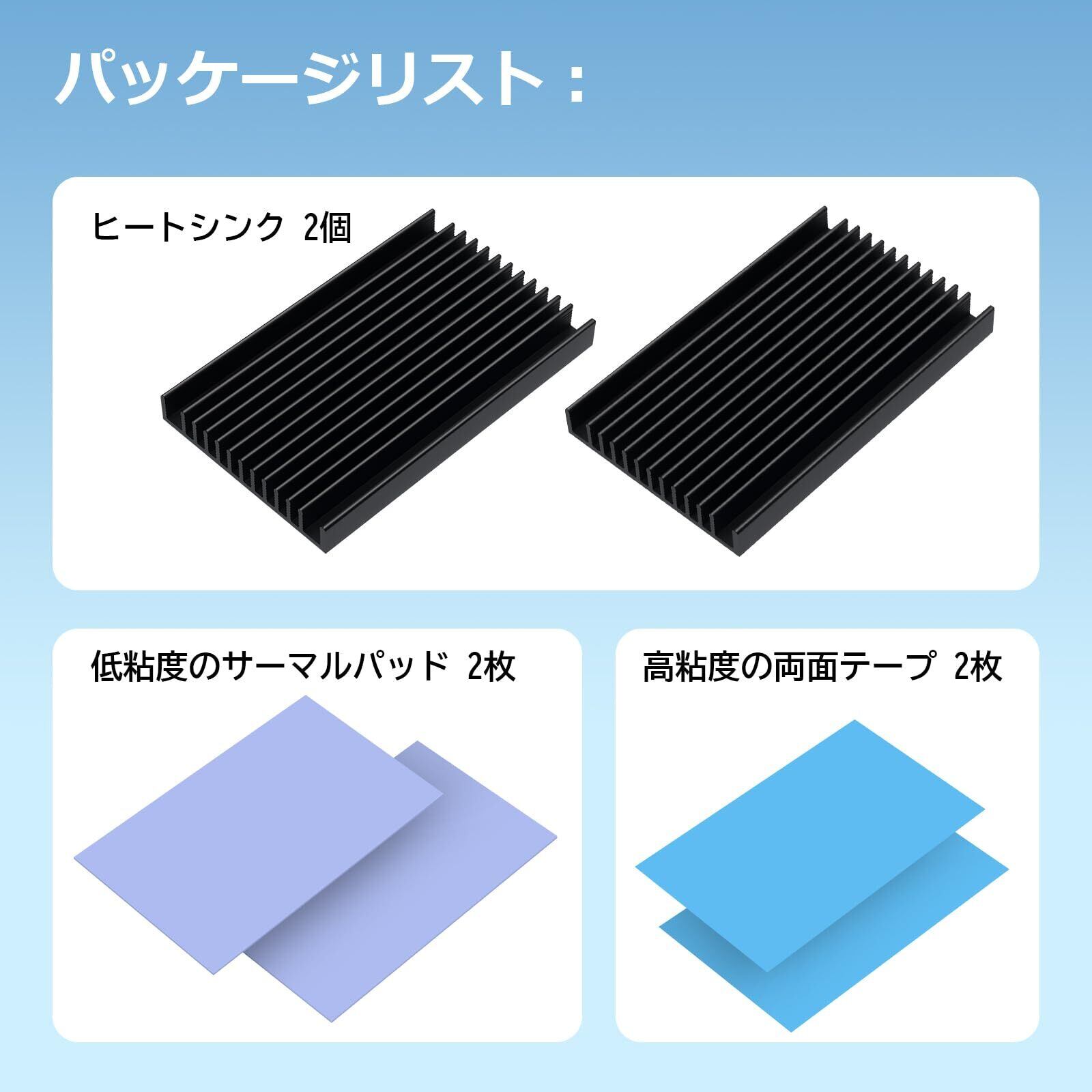 サイズ:100x61x10mm。重量:約72g/個。パッケージ内容:ヒートシンク*2個、両面テープ*2枚、サーマルパッド* 2枚。