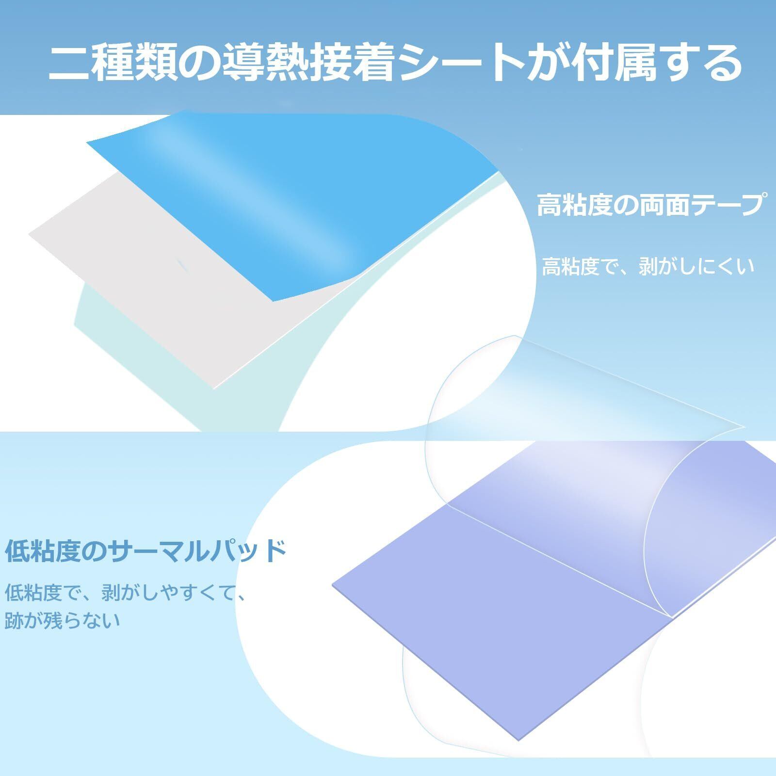 2種類の導熱接着シートは付属します。1. 高粘度の両面テープ。高粘度で、剥がしにくい。2.低粘度のサーマルパッド。剥がしやすくて、跡が残らない。