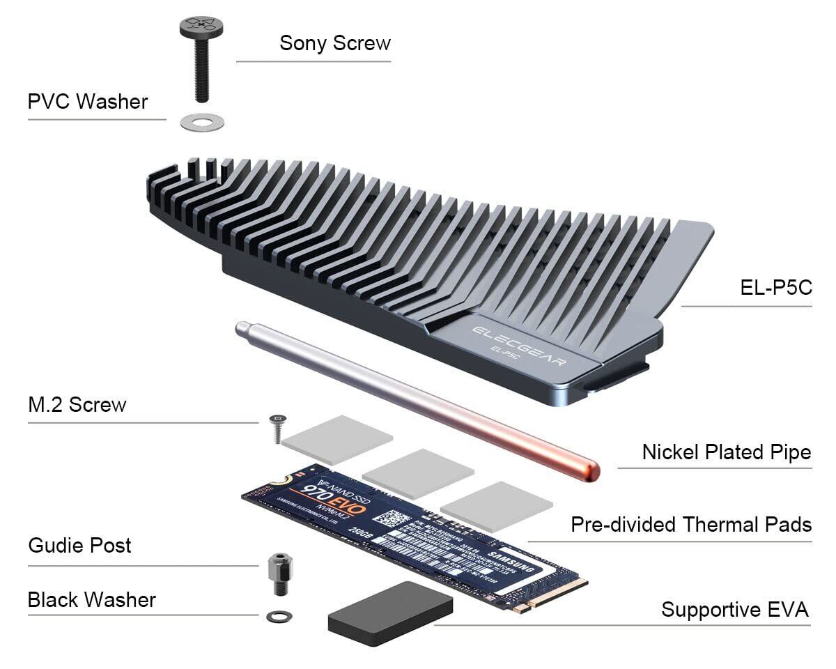 ElecGear PS5 NVMe SSD ヒートシンク、EL-P5C ヒート パイプ + ソリッド アルミニウム ヒートシンク クーラー、プレイステーション 5 内部 PCIe M.2 NVMe 4.0 Gen4 ゲーミング メモリ用、サーマルパッドと、再設計された SSD マウント ポスト キット