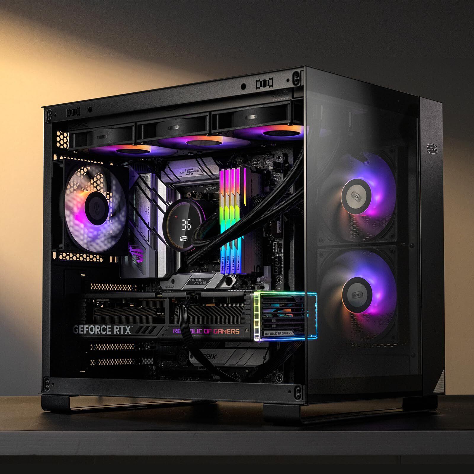 【スタイリッシュなデザイン】 ブラックカラーの洗練されたデザインに、無限のARGBライティング効果が加わり、ゲーミングPCのビジュアルを一層引き立てます。