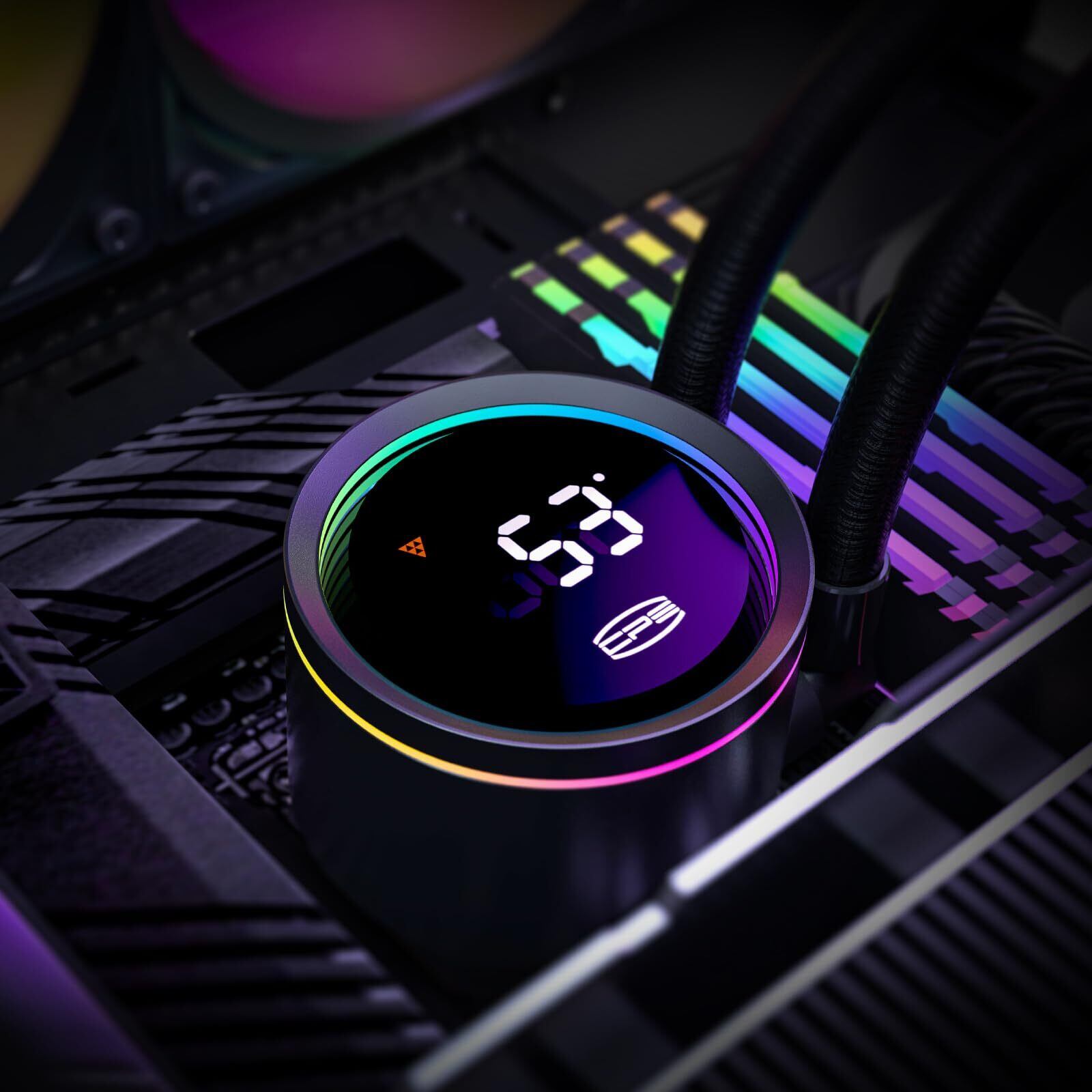 PCCOOLER DA360 PRO ARGB デジタル液体CPUクーラーは、最新のIntelおよびAMDプラットフォームに対応した高性能AIO水冷クーラーです。270度回転可能なLCDディスプレイは、リアルタイムでCPU温度を表示し、ユーザーの視認性とカスタマイズ性を向上させます。大型の360mmラジエーターと高効率の銅製コールドプレートにより、優れた熱伝導性と冷却性能を実現。3基の静音ARGB PWMファンは、強力なエアフローと美しいライティングを提供し、デイジーチェーン接続により配線も簡素化されています。Intel LGA 20XX/1851/1700/1200/115XおよびAMD AM5/AM4ソケットに対応し、幅広いシステムに適合。ブラックカラーの洗練されたデザインに、無限のARGBライティング効果が加わり、ゲーミングPCのビジュアルを一層引き立てます。