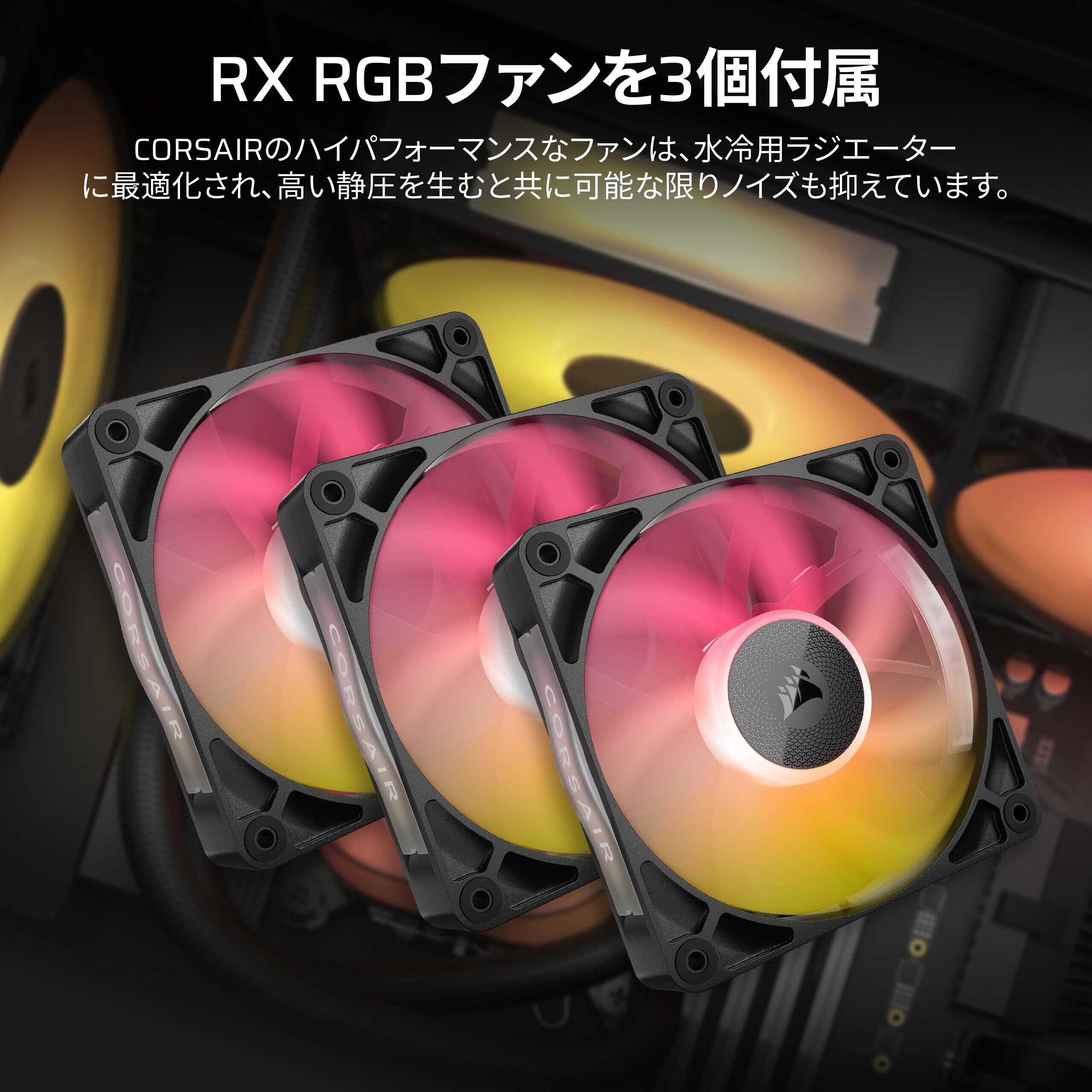 iCUE LINK RX RGBファンを3基搭載。ラジエーターに適した静圧重視のハイパフォーマンスファンです。1基あたり8個のRGB LEDを内蔵しており、ライティング効果も楽しめます。
