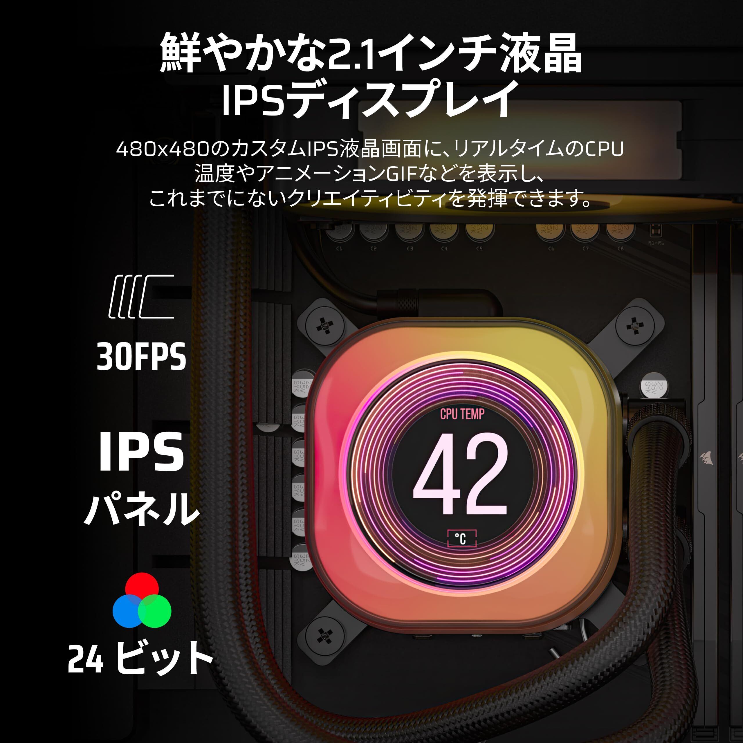 CORSAIR iCUE LINK TITAN 360 RX LCD 水冷式CPUクーラーは、iCUE LINKエコシステムに対応した一体型水冷CPUクーラーです。Intelの次世代CPUソケットのLGA 1851にも対応し、幅広いシステムに導入できます。ポンプヘッドの2.1型液晶ディスプレイはシステム情報や画像、GIF動画など好みに合わせてさまざまなものを表示可能。ポンプヘッドとファンにアドレサブルRGB LEDを内蔵し、ライティング効果も楽しめます。iCUE LINKシステムハブを付属しているため、対応機器を追加してまとめてコントロールすることも可能です。静圧重視のiCUE LINK RX RGBファンを搭載しており、静音かつ高いパフォーマンスを発揮します。 販売元、出荷元が「」のCorsair 製品に関しては全て正規品となっております。に関するお問い合わせ先については、外箱貼付の代理店シールをご確認ください 代理店シールが貼付されていない場合は、Corsair正規代理店株式会社アスクまでお問い合わせください。