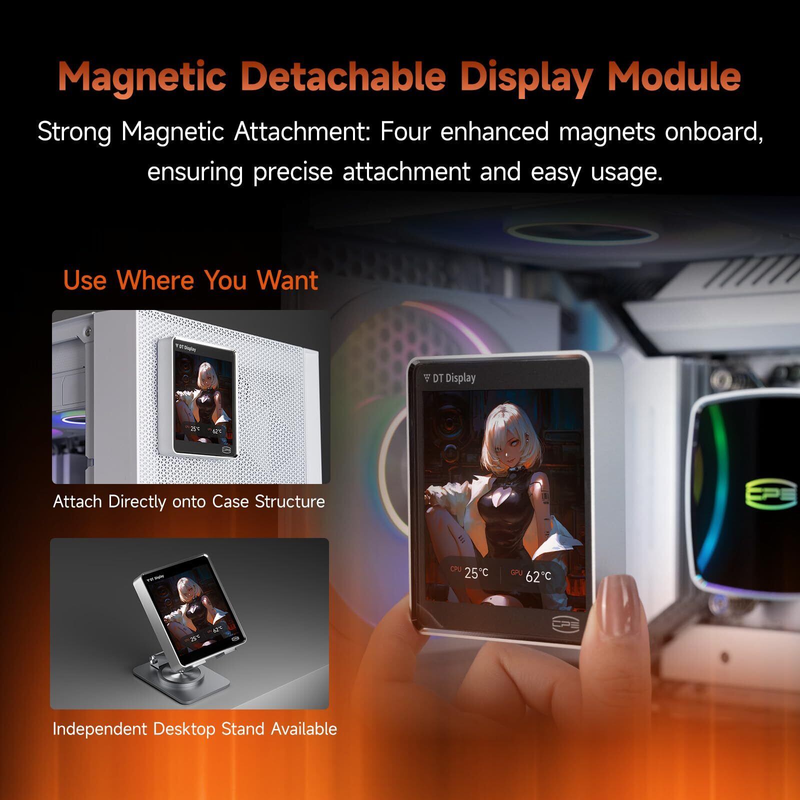 【3.4インチIPS磁気ディスプレイ】480×480ピクセル・60Hzの鮮明な3.4インチIPSパネルは、ウォーターブロックに4つの強力な磁石で着脱装着できます。磁気モジュールはケースや付属のデスクトップスタンドにしっかりドッキング。CPU温度やポンプ/ラジエーターのステータス、アニメーションロゴ、フルスクリーン動画などを表示して、ビルドの注目ポイントになります。