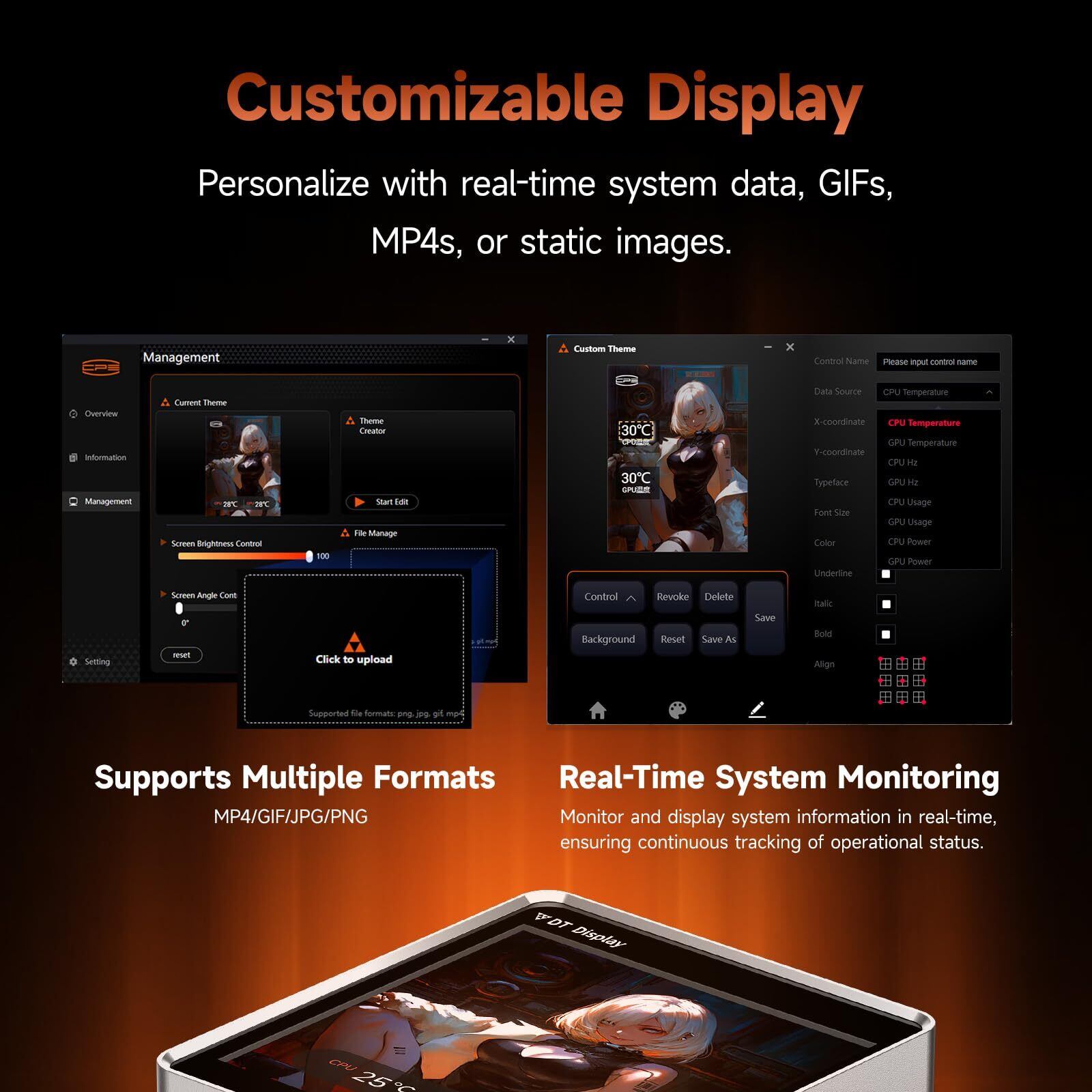 【フルカスタマイズ&マルチメディア対応】ライブモニタリングウィジェットやGIF/MP4再生、JPG/PNGの壁紙で画面を自由にカスタマイズ可能。アニメーションロゴやブランド表示、システムテレメトリを見せることで、外観と機能性の両方を向上させます。