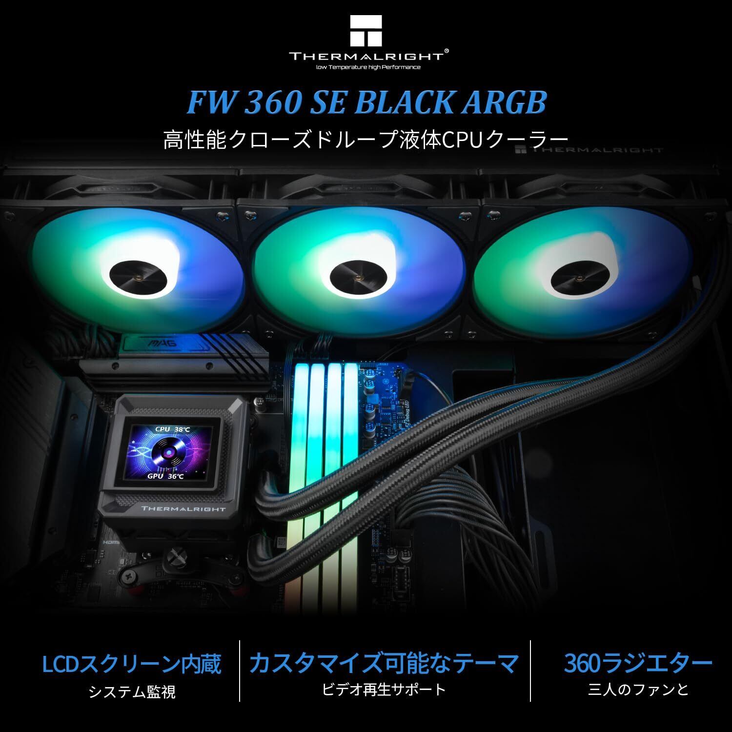 Thermalright FW SE 360 ARGB Black-AIO CPU リキッドクーラー、320x240 解像度の IPS LCD スクリーン、AM4/AM5、Intel LGA1700/1851,2インチ Magnet-画像のための吸収液晶スクリーン-ブラック、PC CPU ウォータークーラー