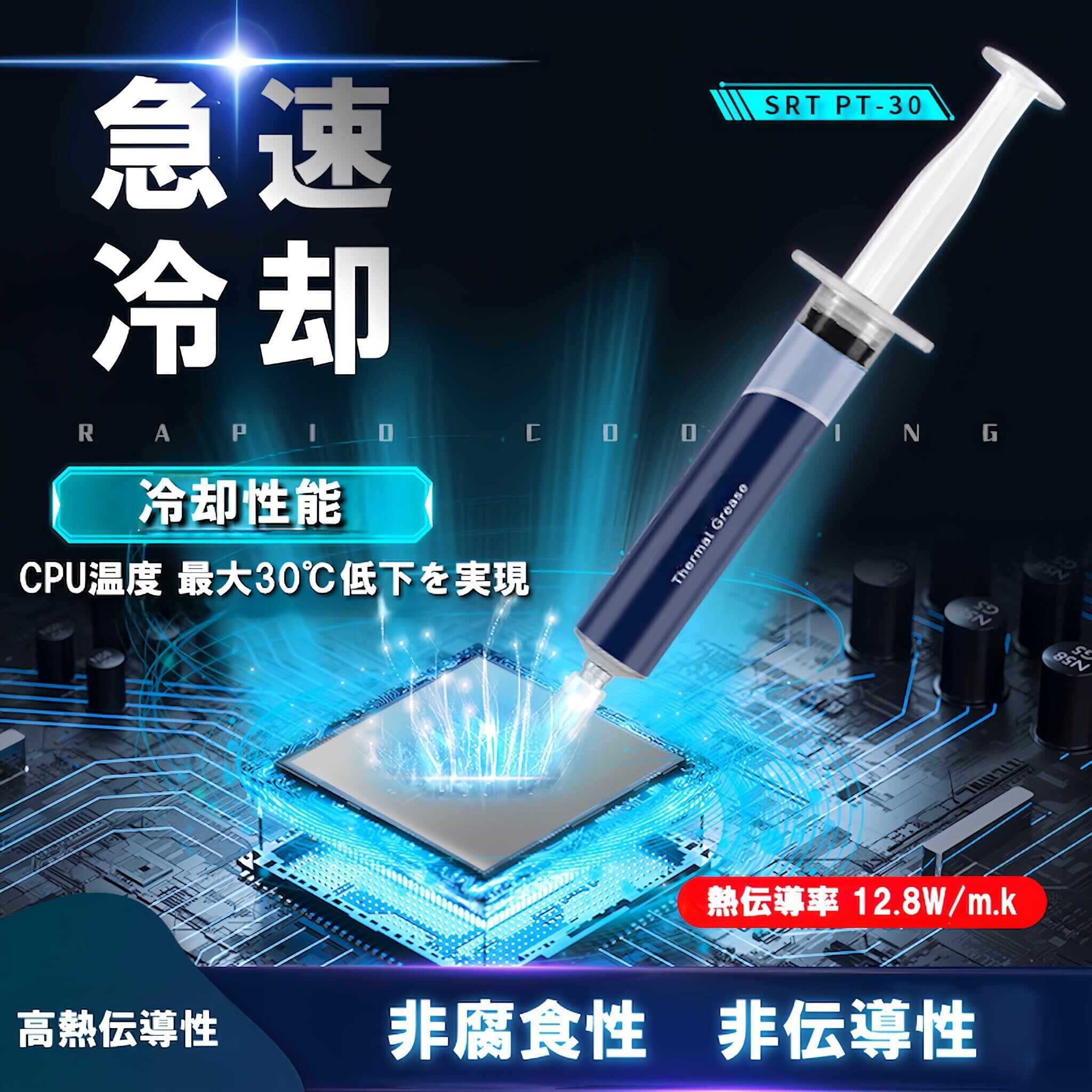 【特徴】熱伝導率12.8W/m·Kを誇る高性能サーマルグリスです。CPUやGPUなどの高発熱パーツからヒートシンクへ効率的に熱を伝達し、最大約30℃の冷却効果を実現します。これにより、パソコンのパフォーマンスを最大限に引き出すことが可能です。