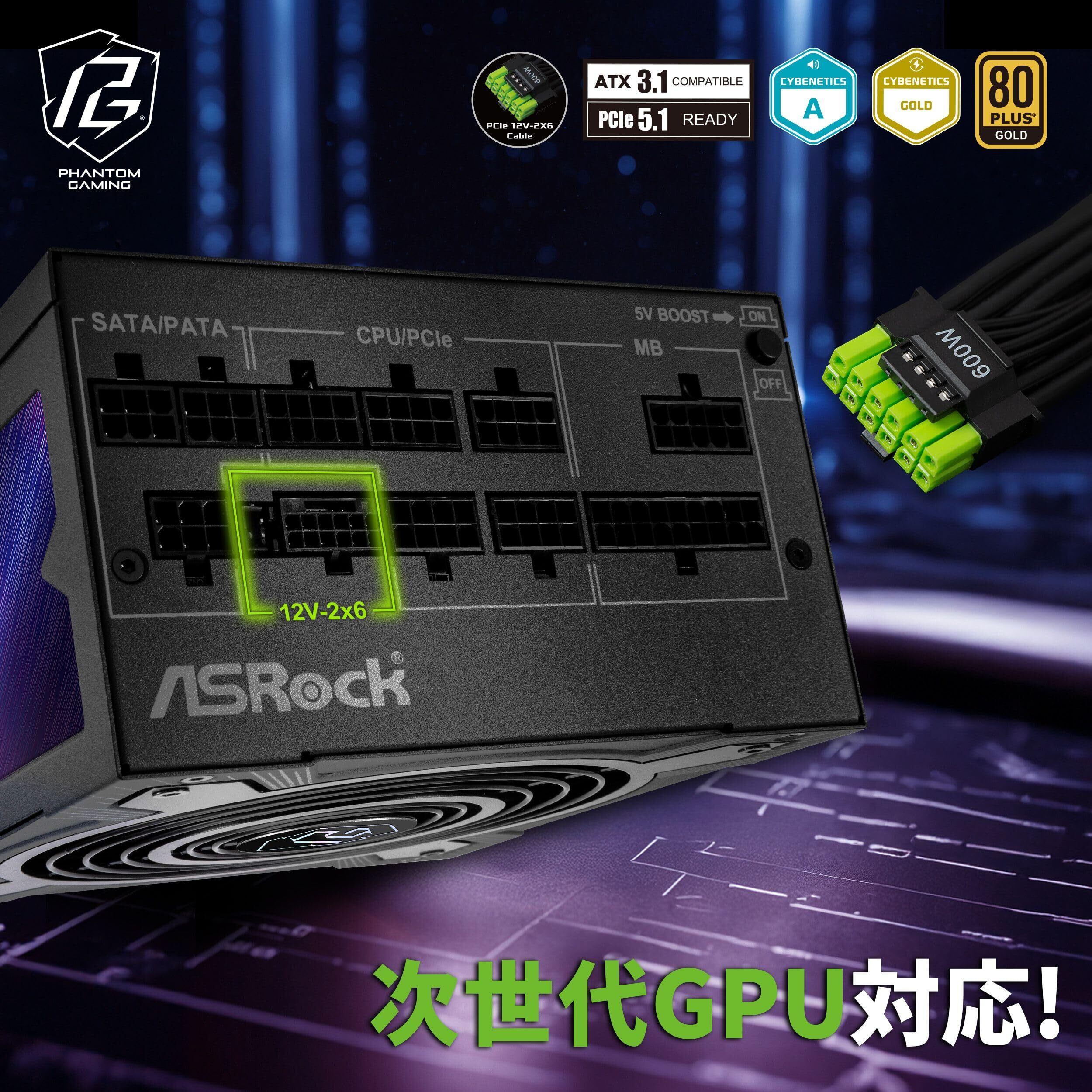ASRock Phantom Gaming 次世代GPU対応 PC電源ユニット 1000W PCIe5.1対応 80PLUS GOLD ATX 3.1 フルモジュラー 12V-2x6 ケーブル付属 PG-1000G
