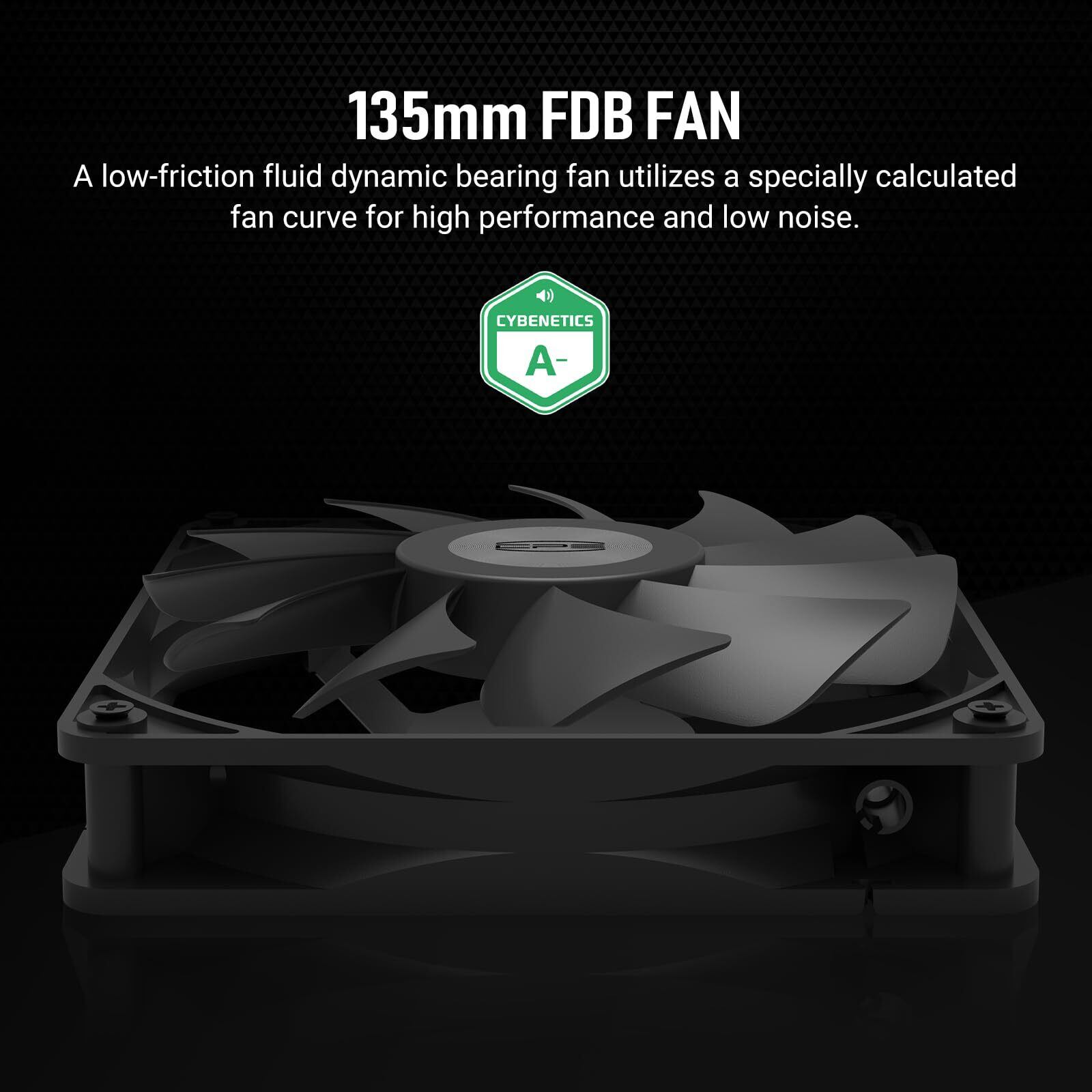 【135mm FDBファン】流体ダイナミックベアリング(FDB)ファンを使用して、優れた放熱性能と低ノイズ性能を考慮して、摩耗を効果的に減らし、長期的な安定性をもたらします。 ゼロRPMファンモードをサポートし、ファンは低温と軽負荷で停止します。