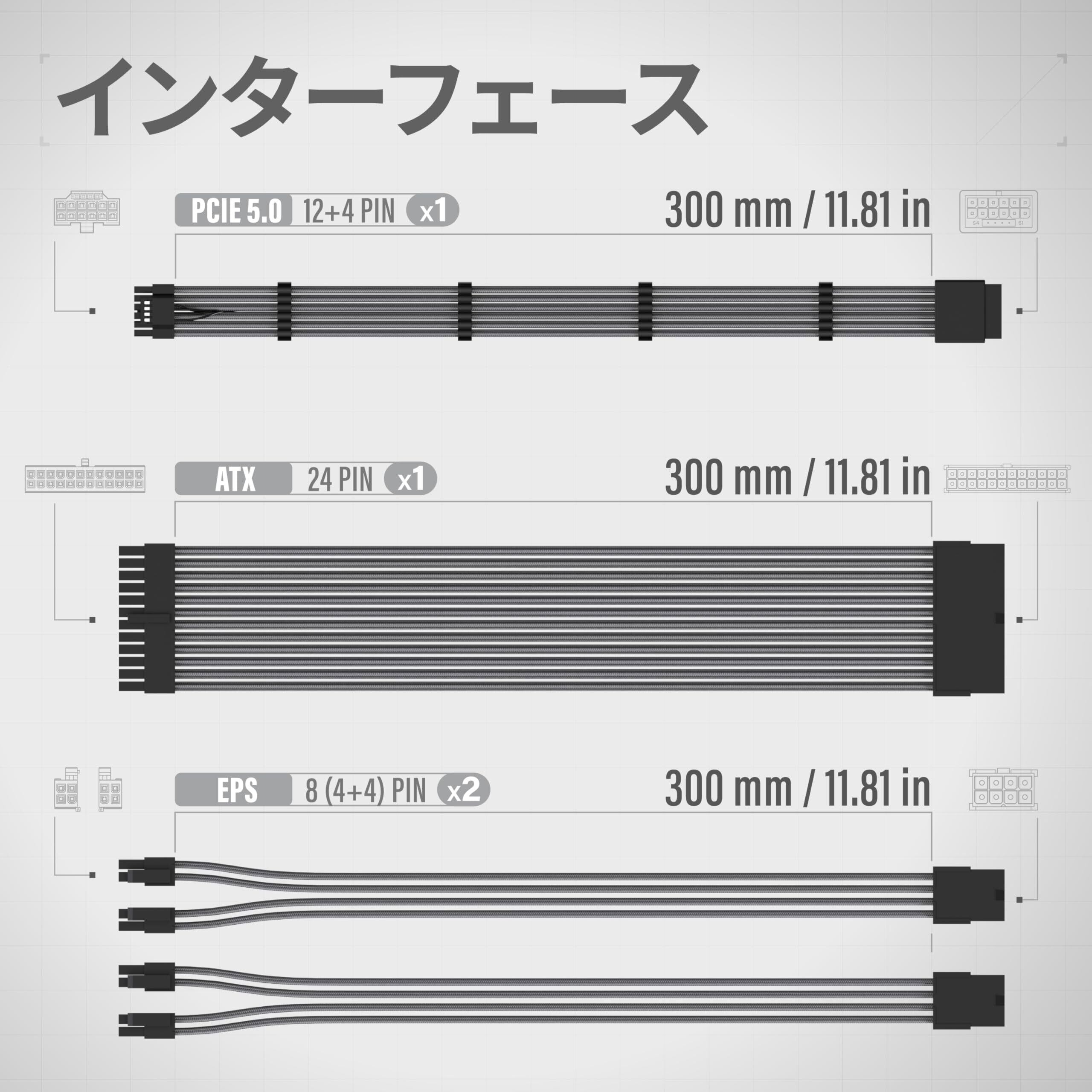 【お得な PSU 延長ケーブル バンドル】4+4ピンEPSケーブル2本、24ピンATXケーブル1本、PCIe 5.0 12VHPWR/12V2X6 12+4ピンGPUケーブル1本を含み、すべてのPCビルドのニーズに対応。