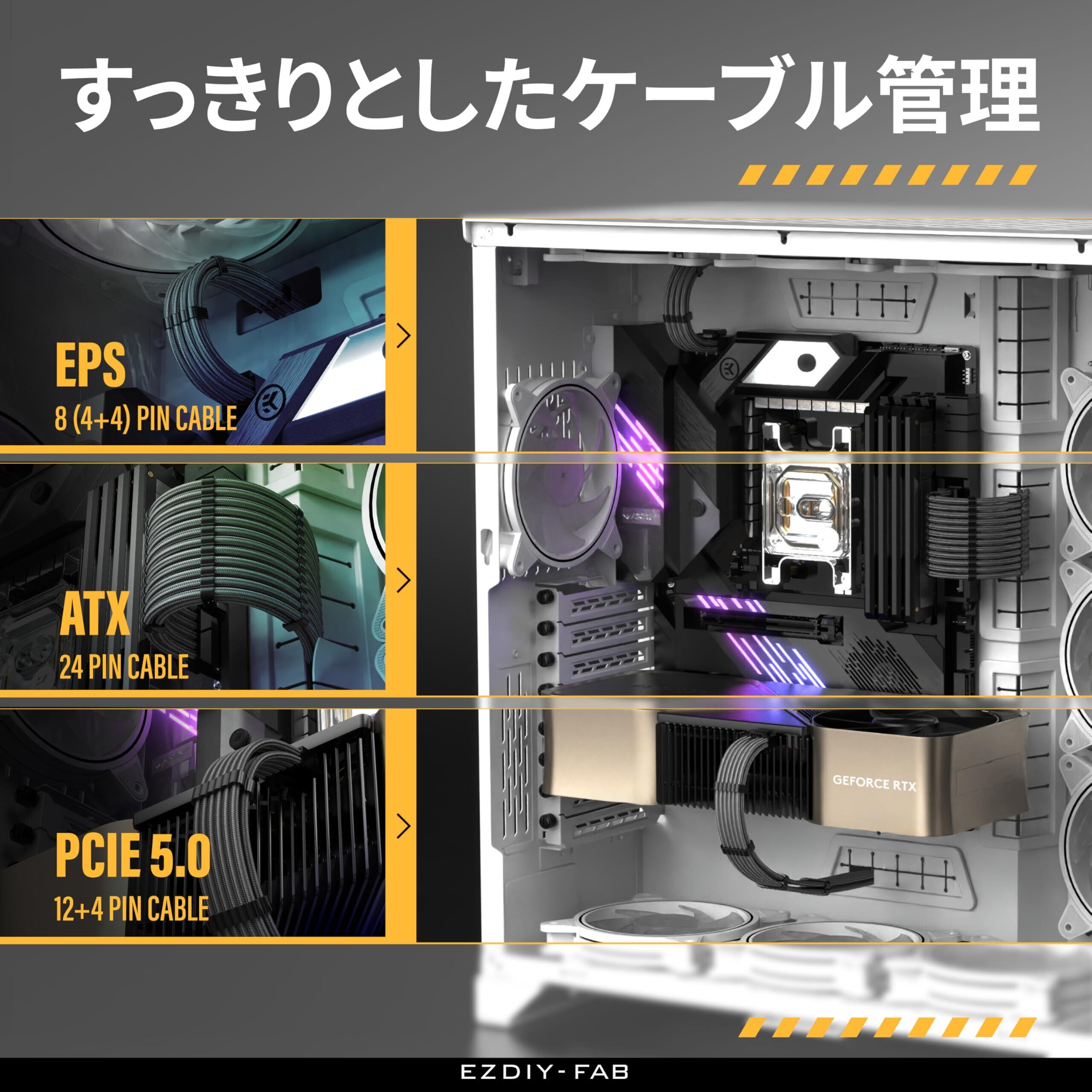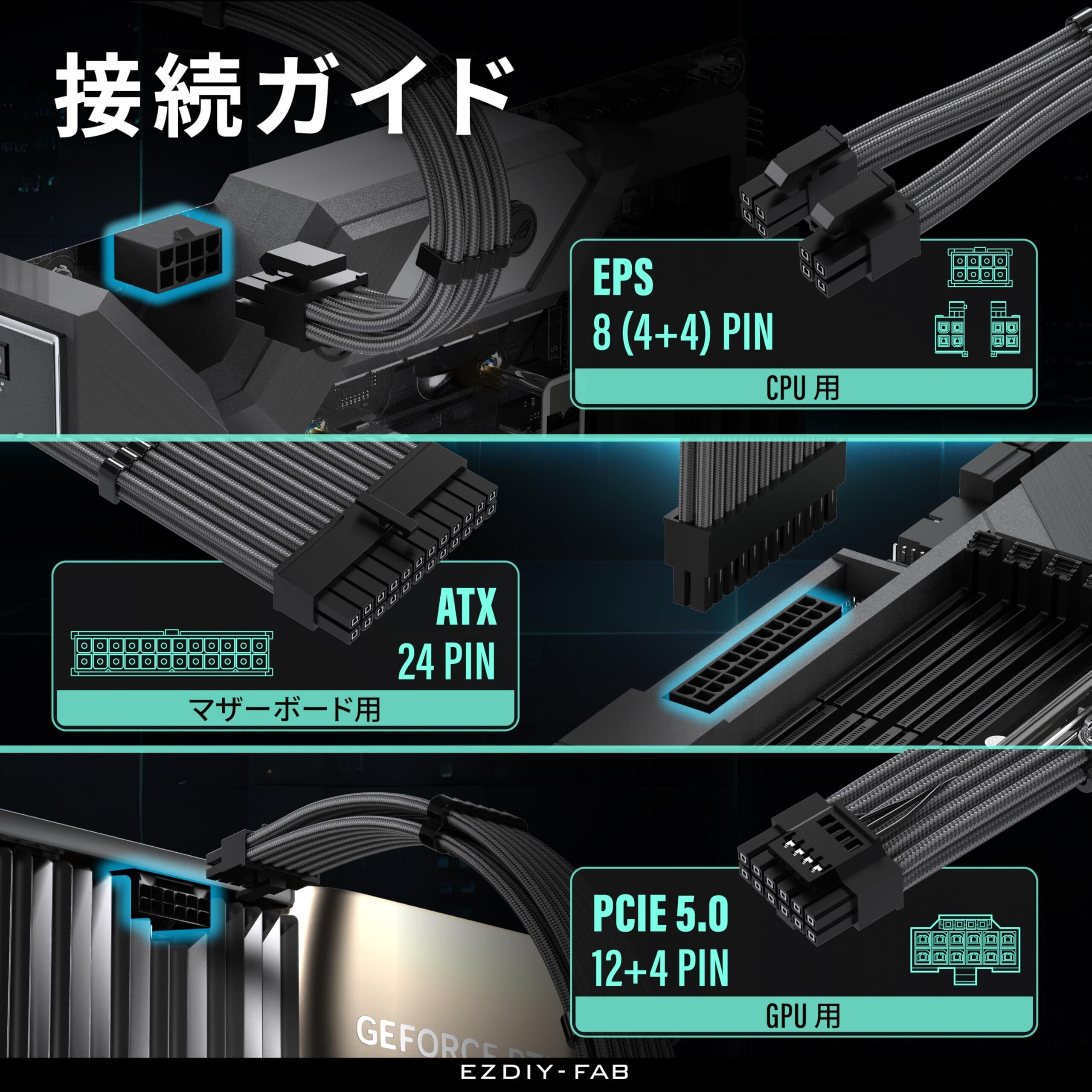 EZDIY-FAB PCIe 5.0 12VHPWR PC電源専用 PSU延長スリーブケーブル 16AWG 高性能銅芯 ATX 24ピン / EPS 8ピン(4+4) / GPU 16ピン(12+4) 対応 1000W PC電源ユニット用 電源延長 30cm - 炭灰