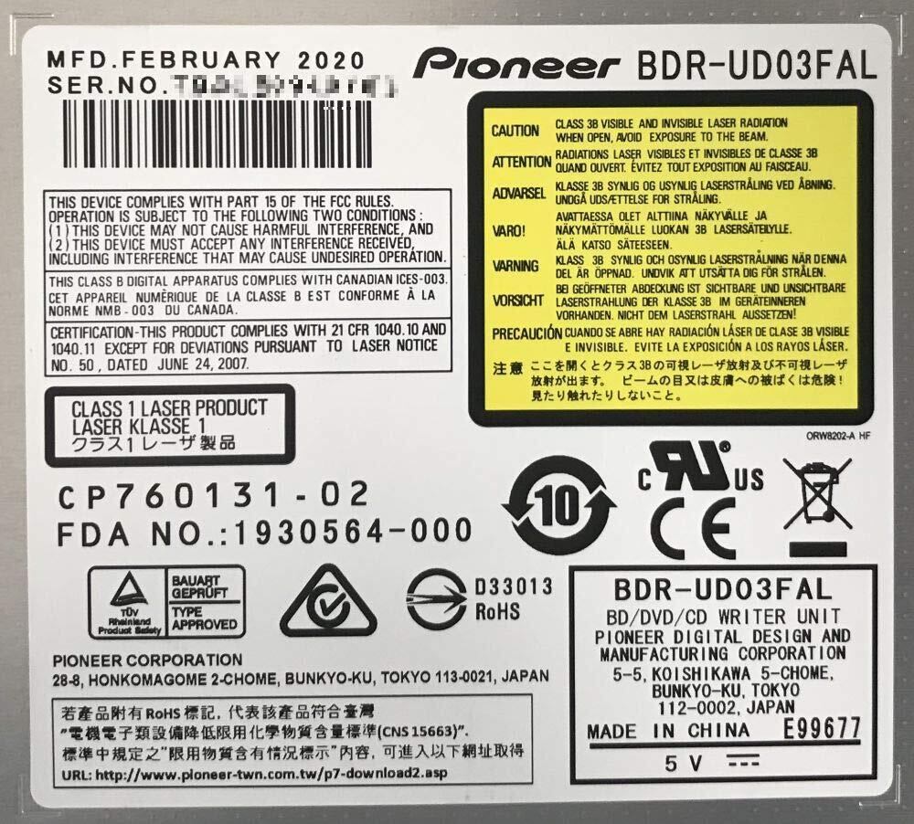 Pioneer パイオニア 9.5mm スリムラインSATA接続 内蔵型 スリム ブルーレイドライブ BDXL対応 BD/DVD/CDライター バルク品 BDR-UD03 ソフト無し