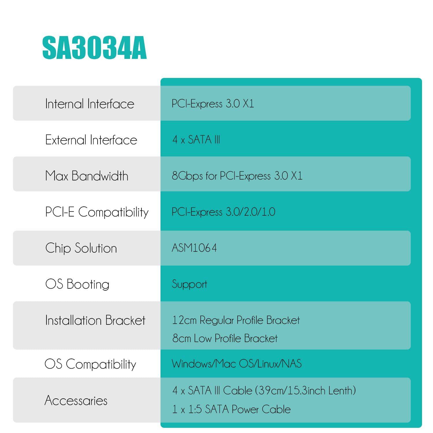GLOTRENDS SA3034A 4ポートPCIe SATA3.0拡張カード、OSブートをサポート、SATAケーブルおよび1:5 SATAスプリッタ電源ケーブルを含む、Windows,Linux,Mac OS,NASと互換性あり