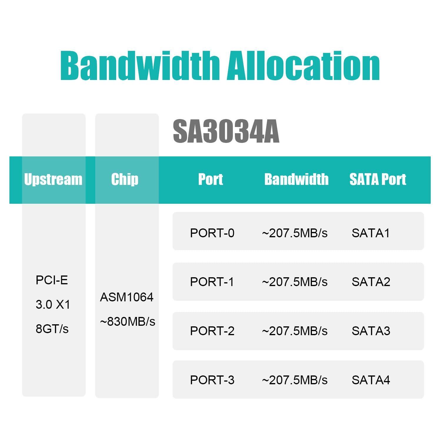 帯域幅の割り当て :ASM1064に基づき、アップストリームはPCI-Express 3.0 X1スピード(8GT/秒)、ダウンストリームは各SATAポートで最大207.5MB/秒の帯域幅を確保。