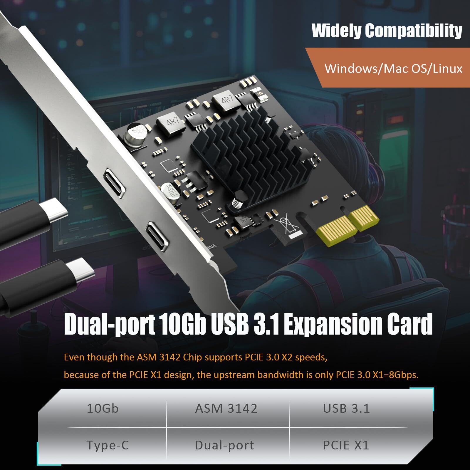 2ポートUSB-C 10Gb PCIE X1拡張カード: ASM 3142チップ搭載、PCIE 3.0 X1は1GB/秒のアップストリーム帯域幅を提供。2基のUSB-Cポートが8Gbpsの速度を共有。
