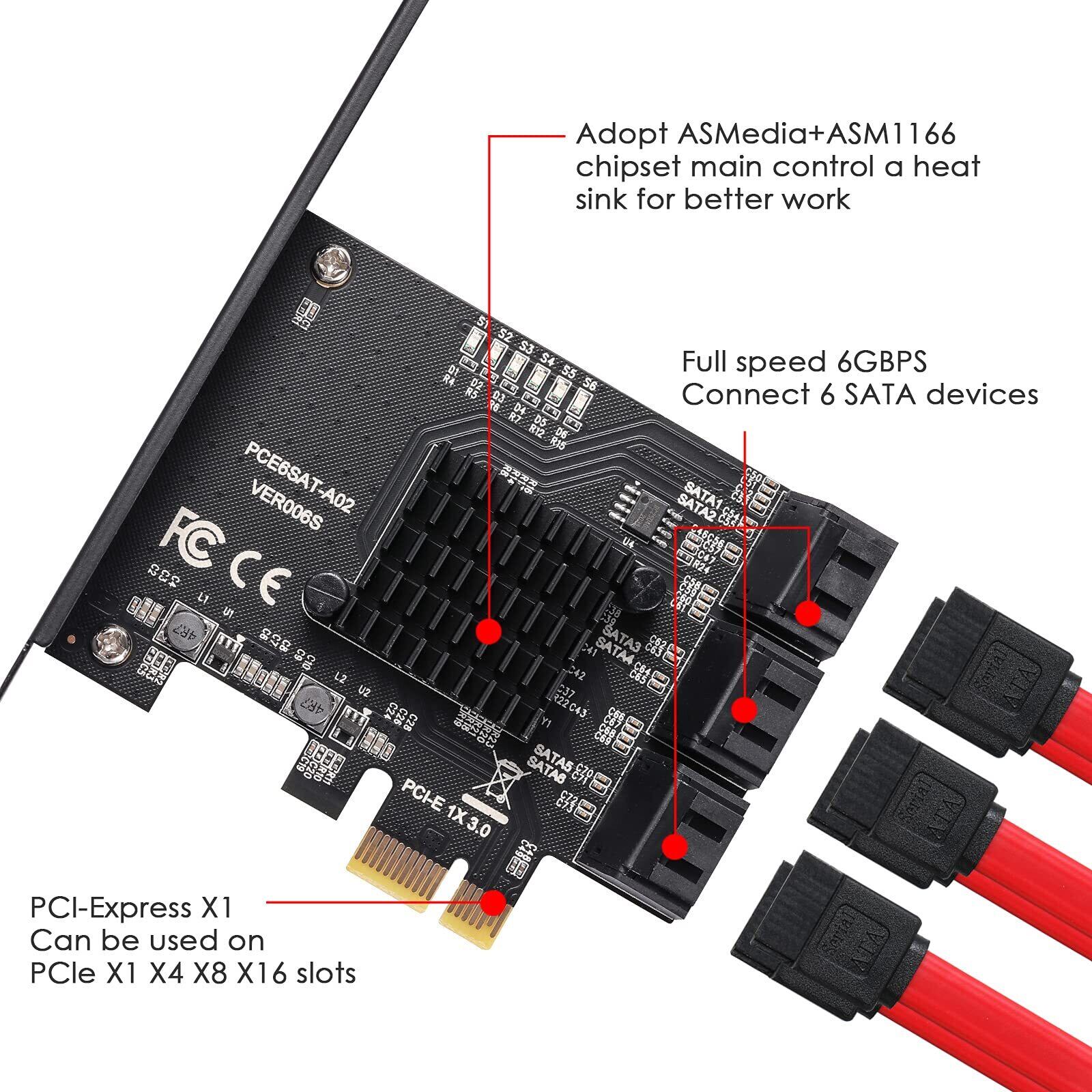 PCI Express SATA3.0 増設ボード 6ポートSATAカード 6Gbps PCI-E SATA 3.0 ヒートシンク付き SATAケーブル付き 拡張カード PCI Express x1 X4 X8 X16用 Windows 7/8/8.1/10 Mac Linux 対応