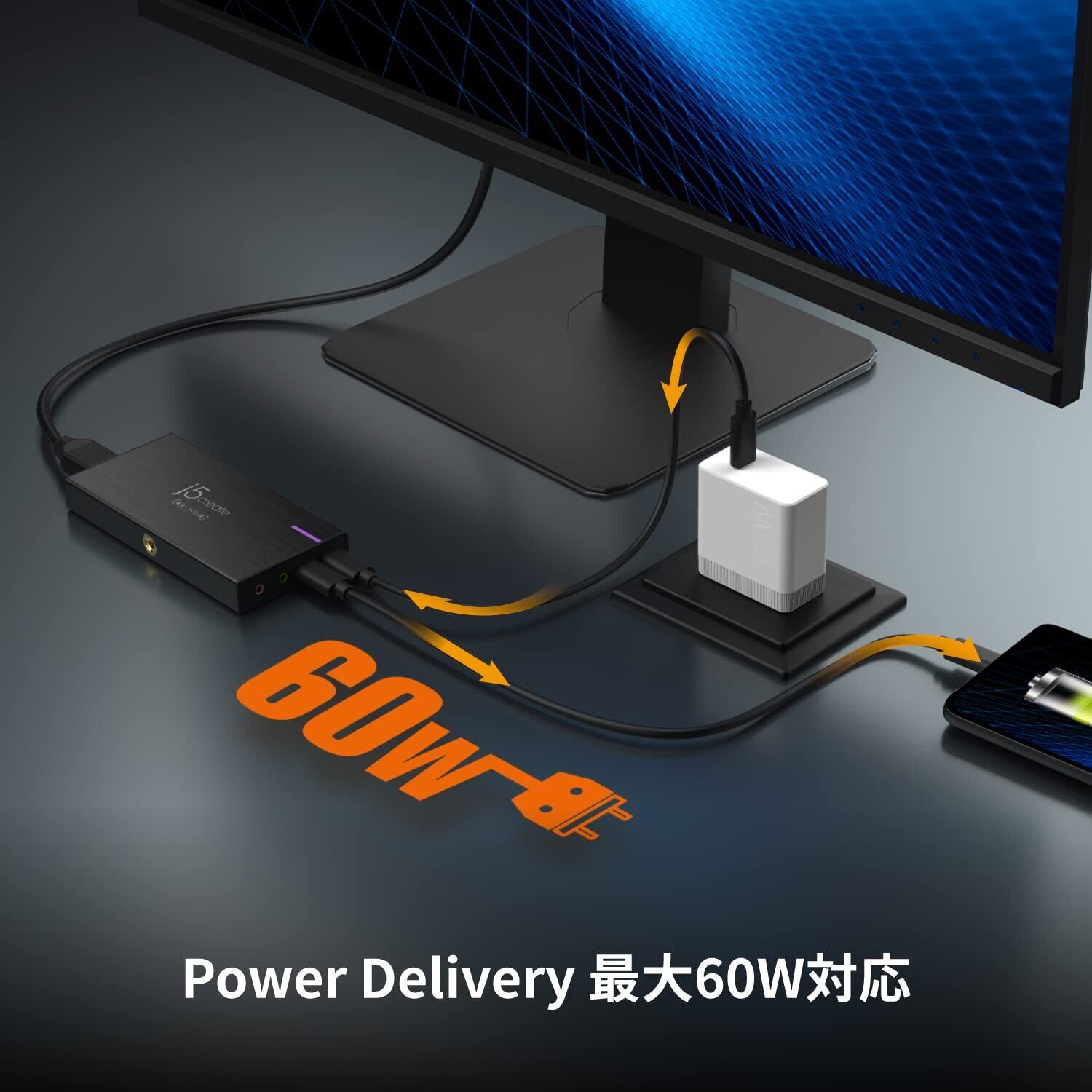 【Power Delivery60W】Power Delivery最大60W対応しています。キャプチャーしながらホスト側(パソコン/スマホ)へ充電ができ、Live配信中に電源切れの心配もありません。
