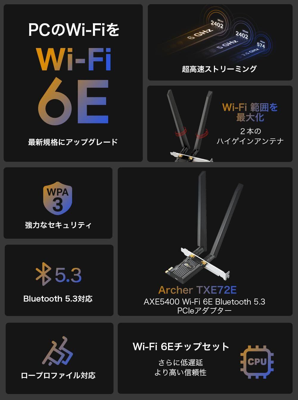 [特徴] Wi-Fi 6E対応トライバンド PCI-Eアダプター。 2402Mbps (6GHz) + 2402Mbps(5GHz) + 574Mbps (2.4GHz)。インストール型。
