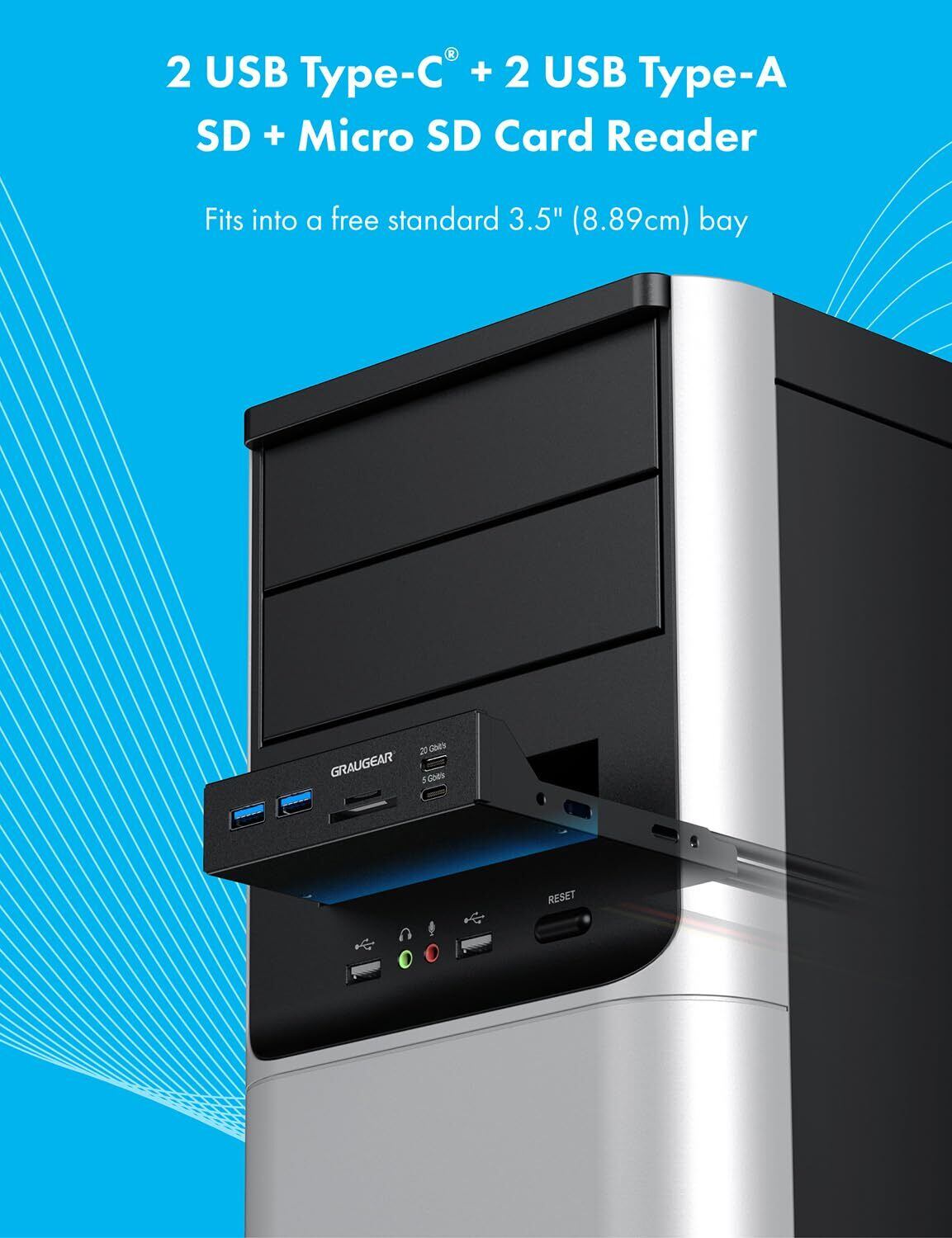 GRAUGEAR 20Gbps USB3.2 Gen2x2 Type-C 3.5インチベイ カードリーダー 内蔵型メモリカードリーダー/ライター 多機能PCマルチフロントパネルに搭載、6ポート USB-C ハブ、SD/MicroSD、USBポート 増設 PC、コンピューターシャーシのフロントブラケット、SATA電源コネクタ接続必要 [G-MP01CR]
