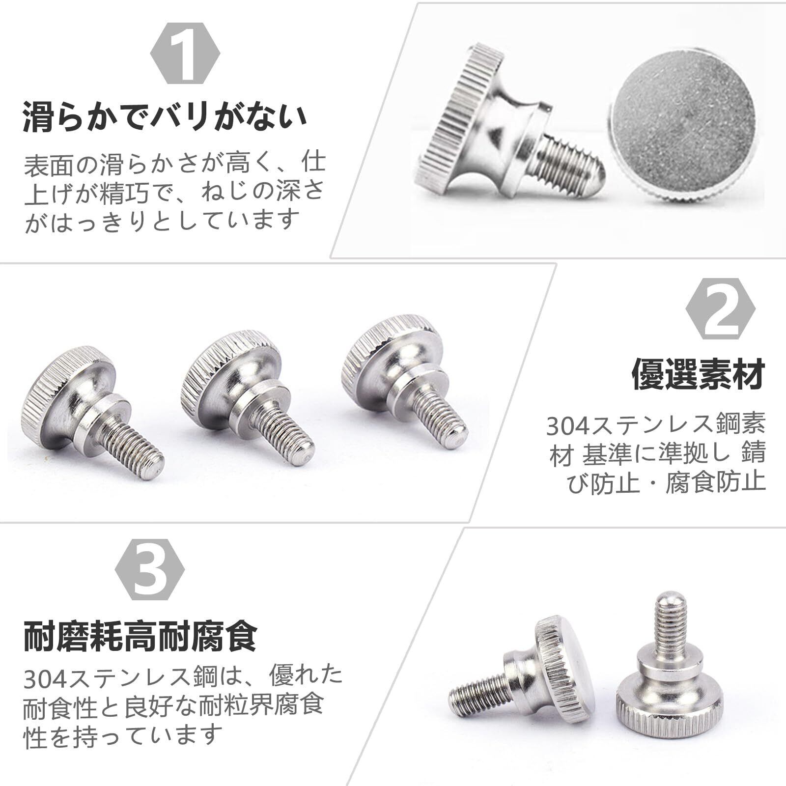 【優れた材質】:304ステンレスを使用しており、機械的強度と耐摩耗性をすることができます。防水、錆防止や腐食防止することができ、耐久性が高いつまみねじです
