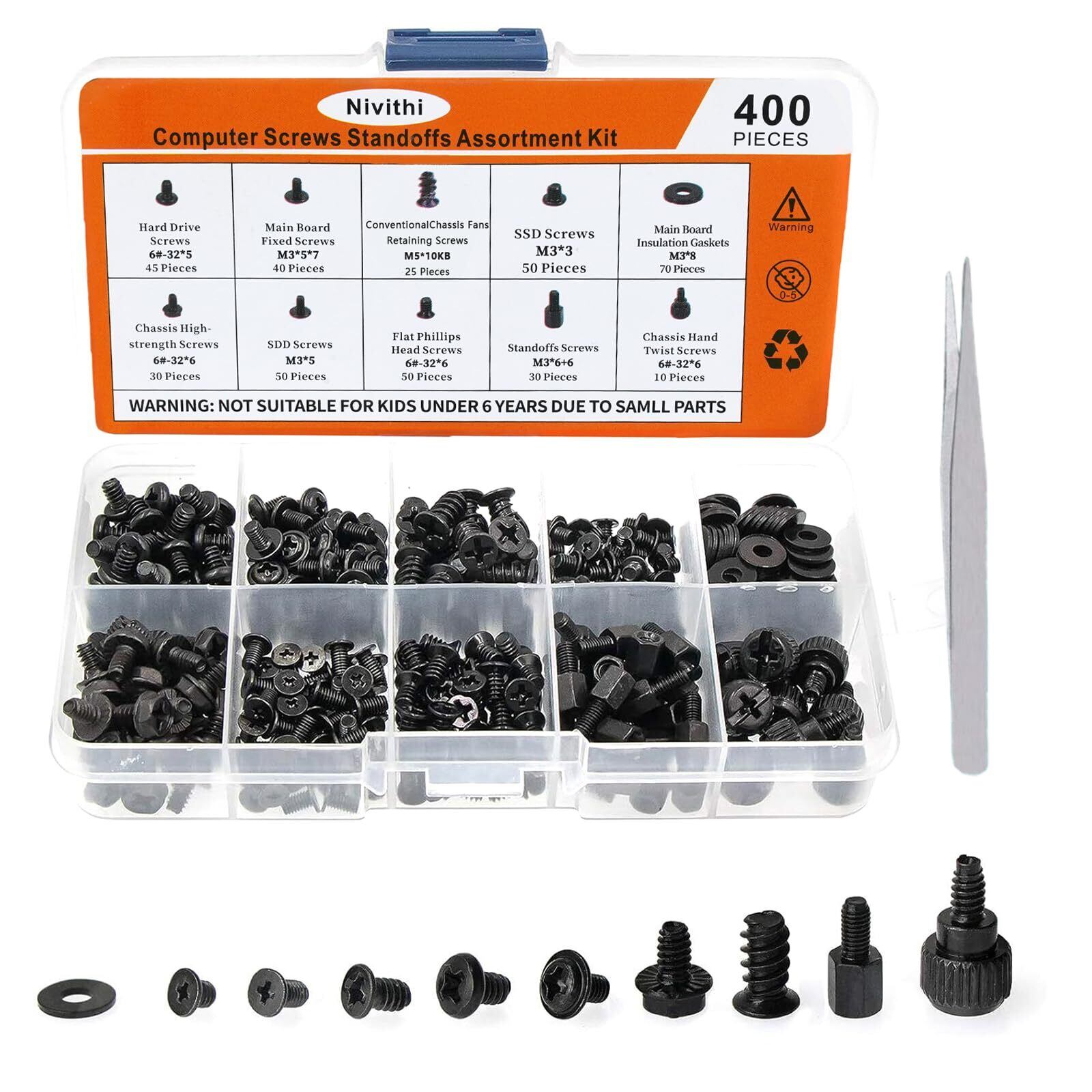 豊富なサイズ展開・400本セット:M3、M3.5、M5サイズを中心に、長さ3mm〜10mmまでのネジをバランスよく揃えた400本入りパソコン用ネジセット。さらに、パーツ保護に役立つナイロン製ワッシャも付属。これ一つで幅広い修理・組立ニーズに対応可能です。