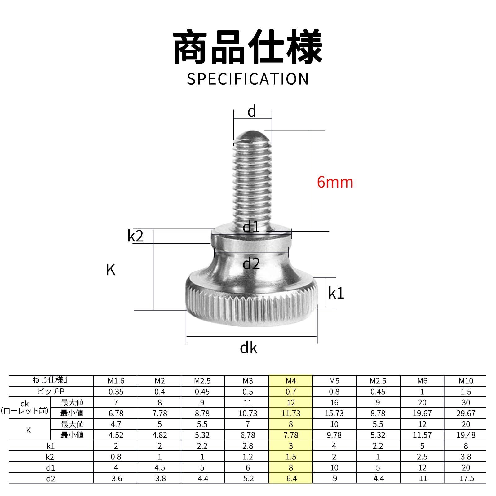 【規格】パッケージの内容:10個 x つまみネジ。 サイズ:M4x6mm ピッチ:0.7mm。カラー:シルバー。