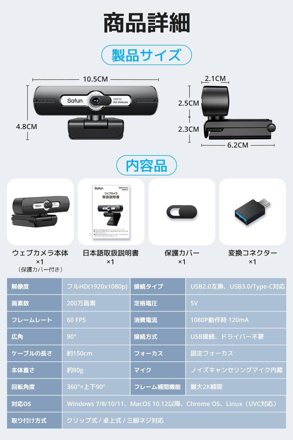 【フルHD 1080P・200万画素の高画質映像】本 ウェブカメラ は、 フルHD 1080P 対応& 200万画素 の 高精細 な映像を実現。 オンライン会議 や ビデオ通話 、 Zoom 、 Skype 、 Teams などに最適な WEBカメラ です。なめらかでクリアな映像で、 在宅勤務 や テレワーク をより快適にサポートする webカメラ 60fps です。