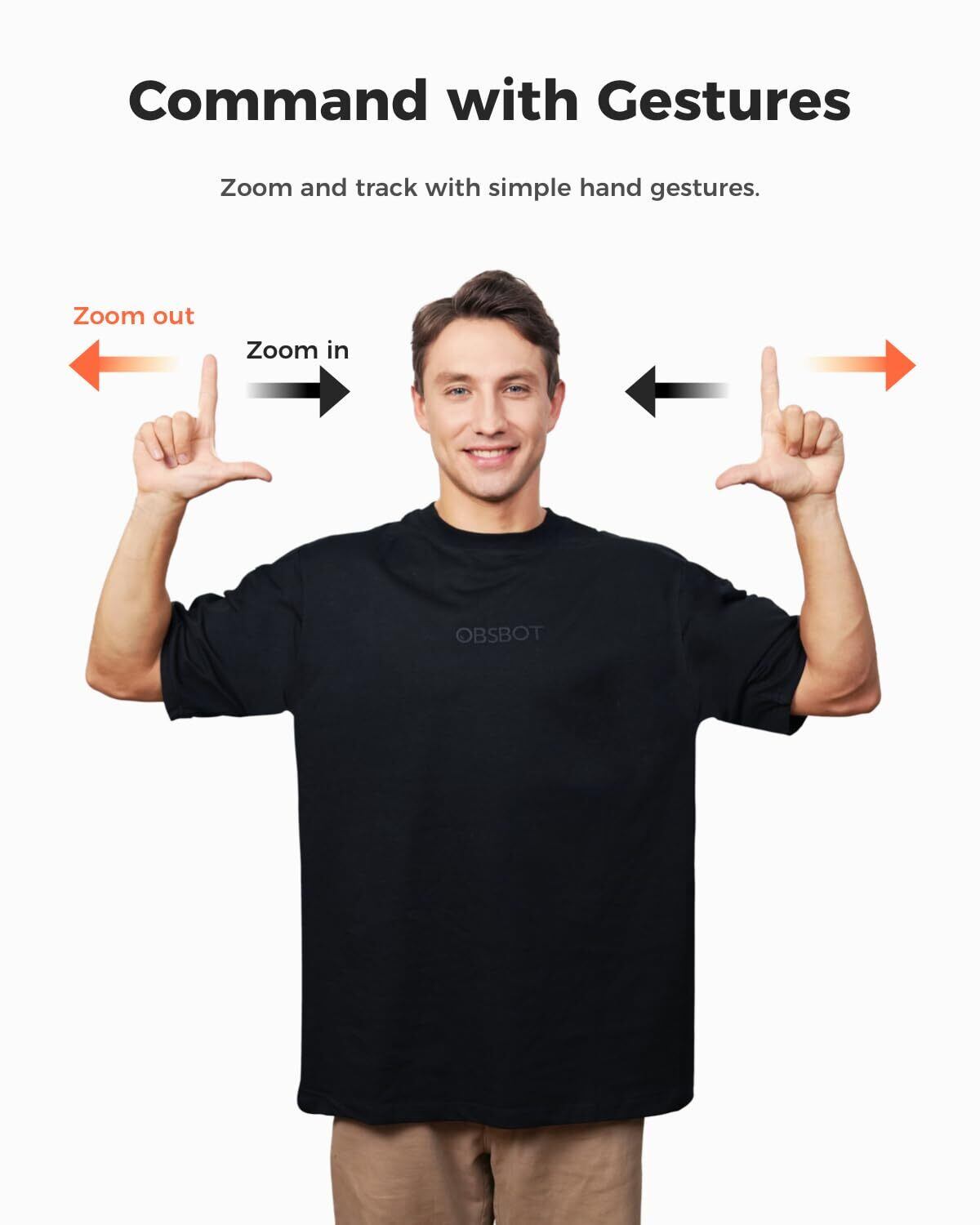 【分かりやすい直感操作】カメラの向きを変更することで、スリップ状態のオン・オフができます。プレゼン発表会などカメラと離れたとき、カメラに向け、特定の手ポーズを出すと、追跡対象の登録・解除、ズーム調整は簡単に行います。