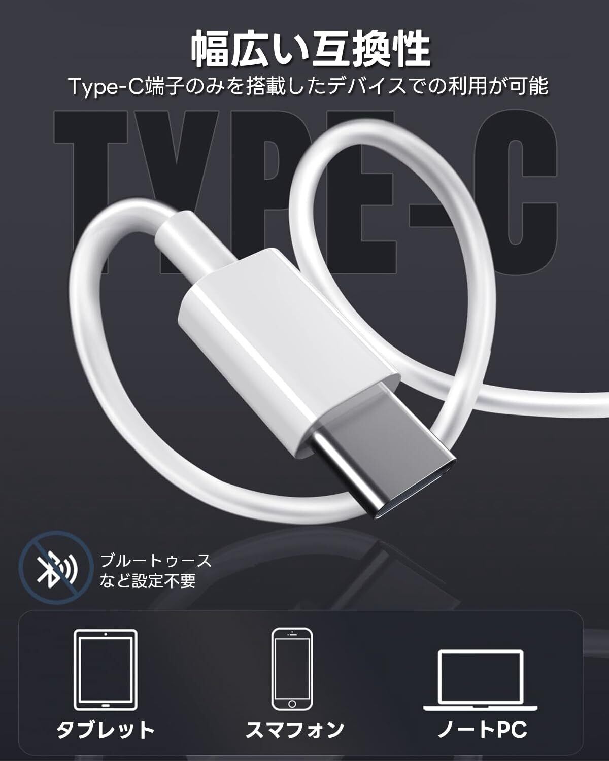 【タイプ C有線 イヤホン・マイク付き】タイプCイヤホンは、内蔵マイクと通話ノイズキャンセリング技術を採用しており、周囲の雑音を効果的に低減し、音楽や相手の声をよりクリアに再現します。これにより、外部ノイズの影響を受けずにスムーズな通話を実現し、高音質な通話体験を提供します。(注意:3.5mm端子搭載のスマートフォンには非対応です)
