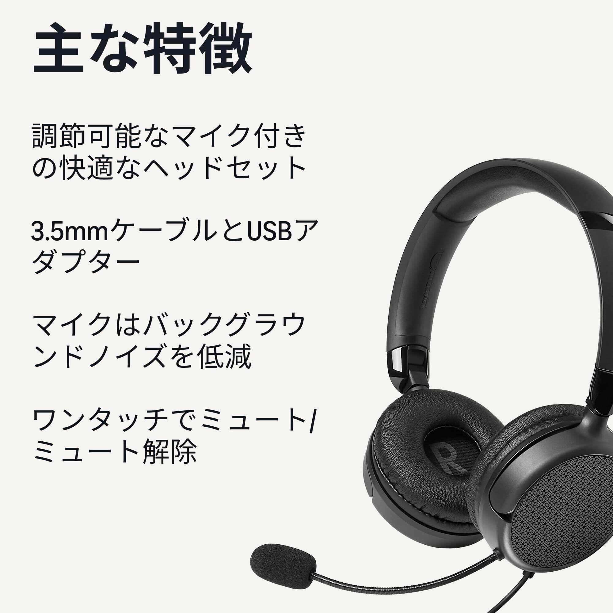 ベーシック ヘッドセット マイク付き 有線 オンイヤー 3.5mm/USB-Aポート対応 インラインコントローラ搭載 折りたたみ式 ワンサイズ ブラック