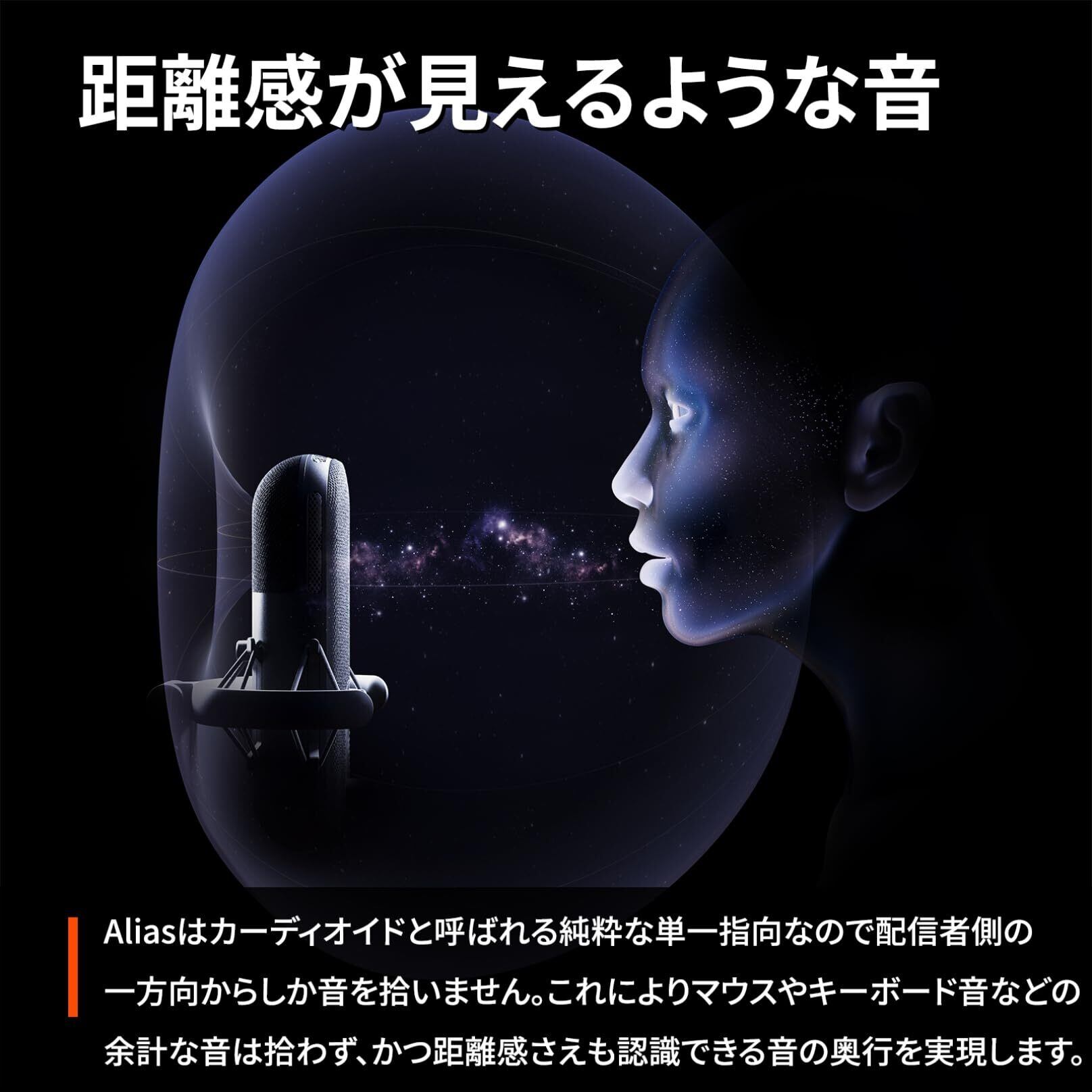 【“距離感”が見えるような音】一般的な配信用マイクはスーパーカーディオイドと呼ばれる単一指向性のため、PCの駆動音やマウスやキーボードの音を拾いやすい構造になっていますが、Aliasはカーディオイドと呼ばれる純粋な単一指向なので配信者側の一方向からしか音を拾いません。この構造により余計な音は拾わず、かつ距離感さえも認識できる音の奥行を実現します。