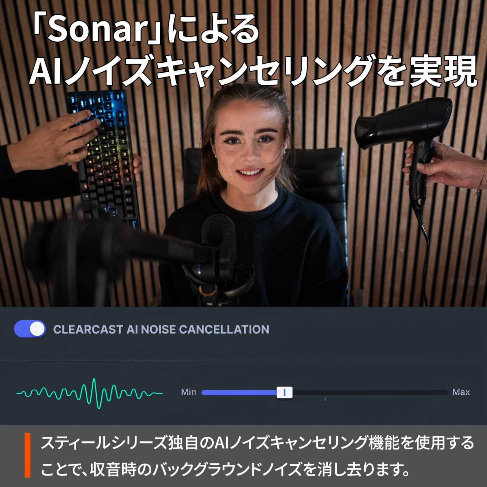 【SONARによりスタジオ品質の配信が可能】独自ソフトウェアSONARを使用することで、それぞれのメディアの細かな音量調整やミキシングが可能です。バッググラウンドで流れる音楽の上げ下げや、ゲーム音やチャットオンの調整なども簡単に行えます。また、スティールシリーズ独自のAIノイズキャンセリング機能を使用することで、収音時のバックグラウンドノイズを消し去ります。