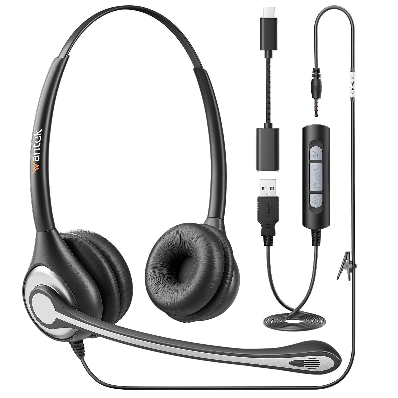 WantekヘッドセットUSB 3.5mm TypeC 両耳 ノイズキャンセリングマイク付きとオンライン制御有線PC用ヘッドホン Skype、Web会議、在宅勤務、業務用、リモートワーク、コールセンターに適用される クリアな通話 超軽量 超快適 TypeC接続線付き 【適格請求書発行対象】