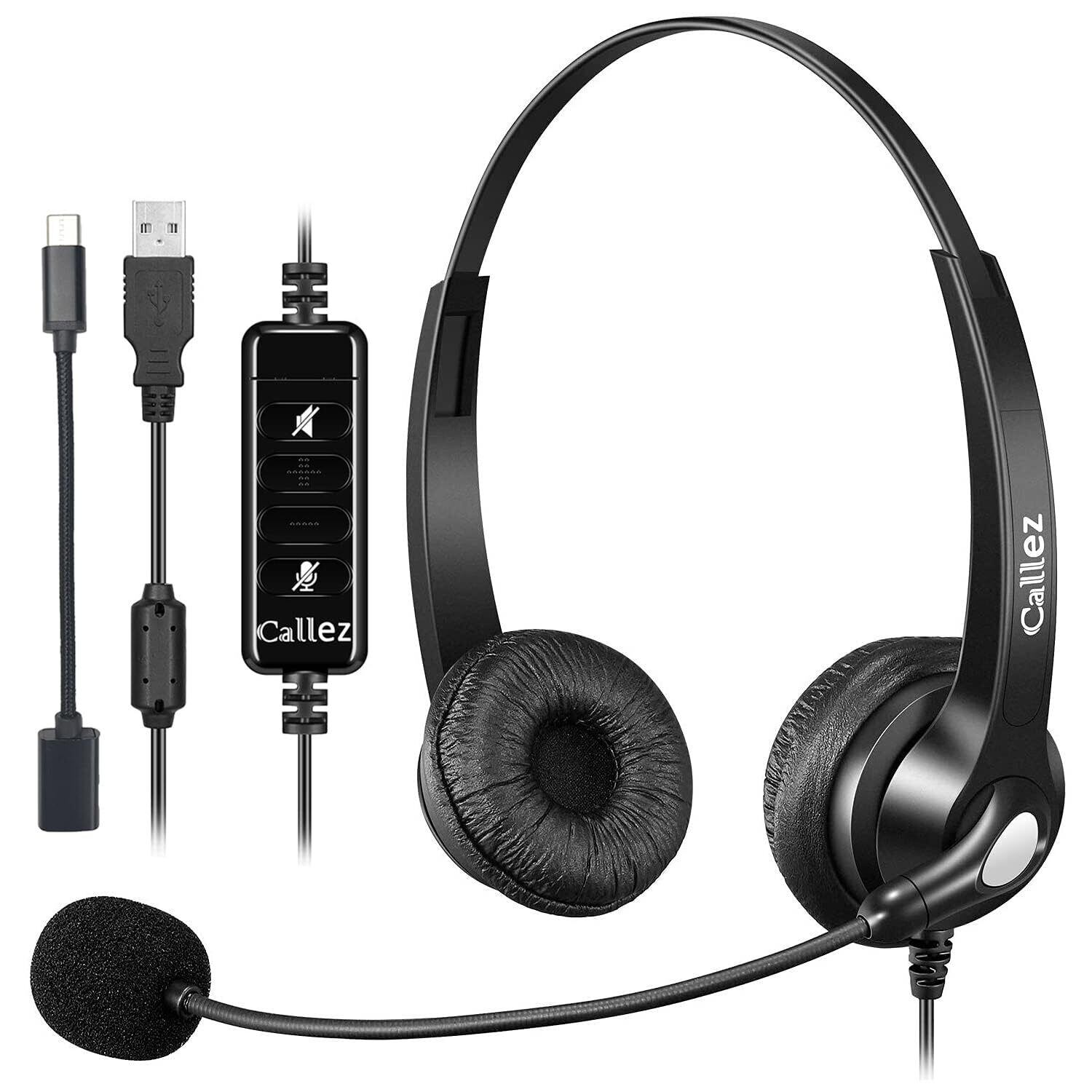 Callez ヘッドセットUSB接続 ノイズキャンセリングマイク付き 両耳 有線ヘッドセット Type-C PC用ヘッドホン ミュート機能と音量調節付き タイプc接続 スマホ Mac PC対応 Skype Zoom Web会議 テレワーク オンライン会議 コールセンター適用 330°回転 軽量 快適耐久設計